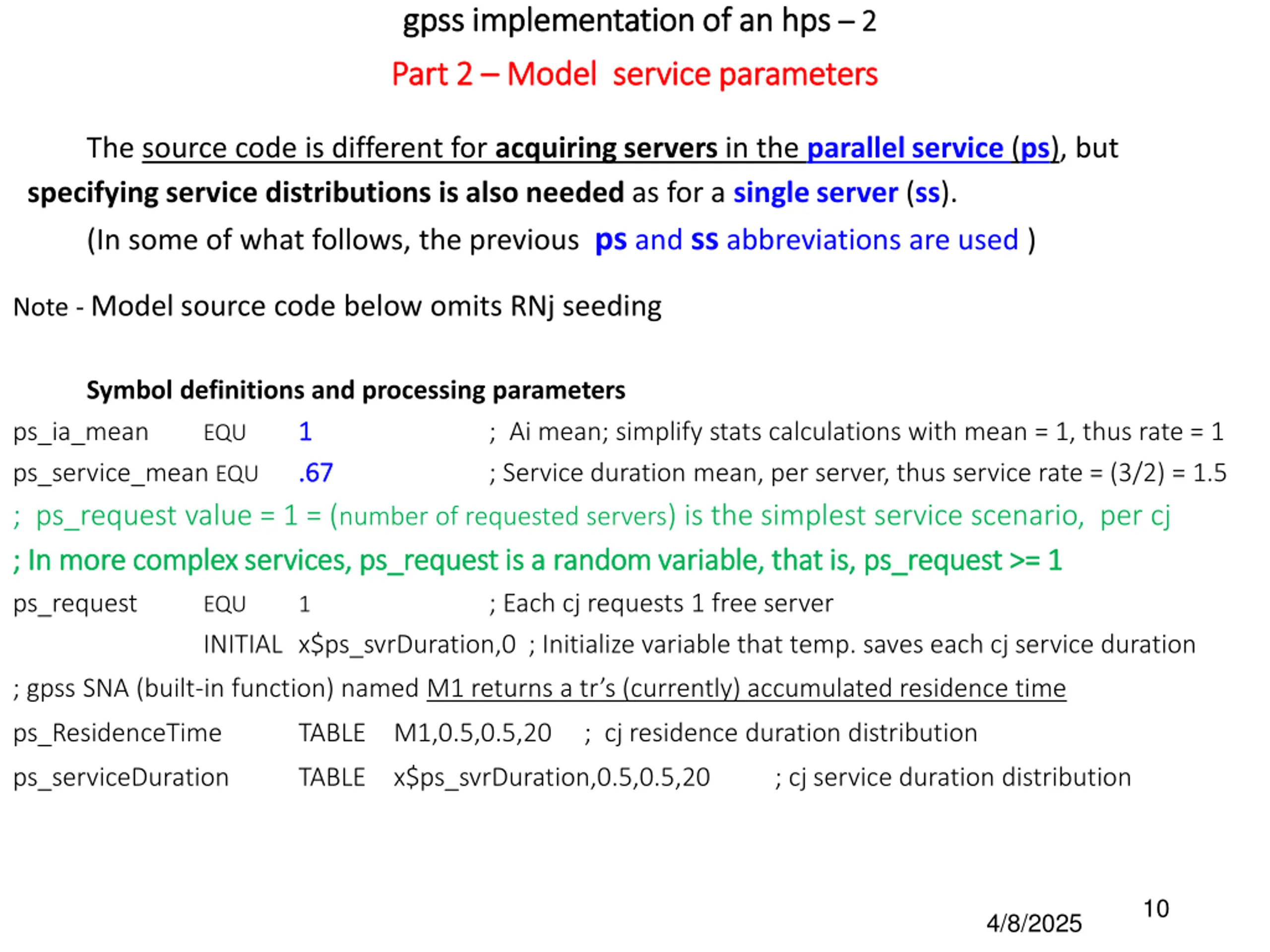 gpss implementation of an gpss implementation of an hps hps 2 2 Part 2 Part 2 Model service parameters Model service parameters The source code is different for acquiring servers in the parallel service (ps), but specifying service distributions is also needed as for a single server (ss). (In some of what follows, the previous ps and ss abbreviations are used ) Note - Modelsource code below omits RNj seeding ps_ia_mean ps_service_mean EQU ; ps_request value = 1 = (number of requested servers) is the simplest service scenario, per cj ; In more complex services, ; In more complex services, ps_request ps_request is a random variable, that is, is a random variable, that is, ps_request ps_request EQU 1 ; Each cj requests 1 free server INITIAL x$ps_svrDuration,0; Initialize variable that temp. saves each cj service duration Symbol definitions and processing parameters 1 1 .67 .67 ; Ai mean; simplify stats calculations with mean = 1, thus rate = 1 ; Service duration mean, per server, thus service rate = (3/2) = 1.5 EQU ps_request >= 1 >= 1 ; gpss SNA (built-in function) named M1 returns a tr s (currently) accumulated residence time ps_ResidenceTime TABLE M1,0.5,0.5,20 ; cj residence duration distribution ps_serviceDuration TABLE x$ps_svrDuration,0.5,0.5,20 ; cj service duration distribution 10 4/8/2025