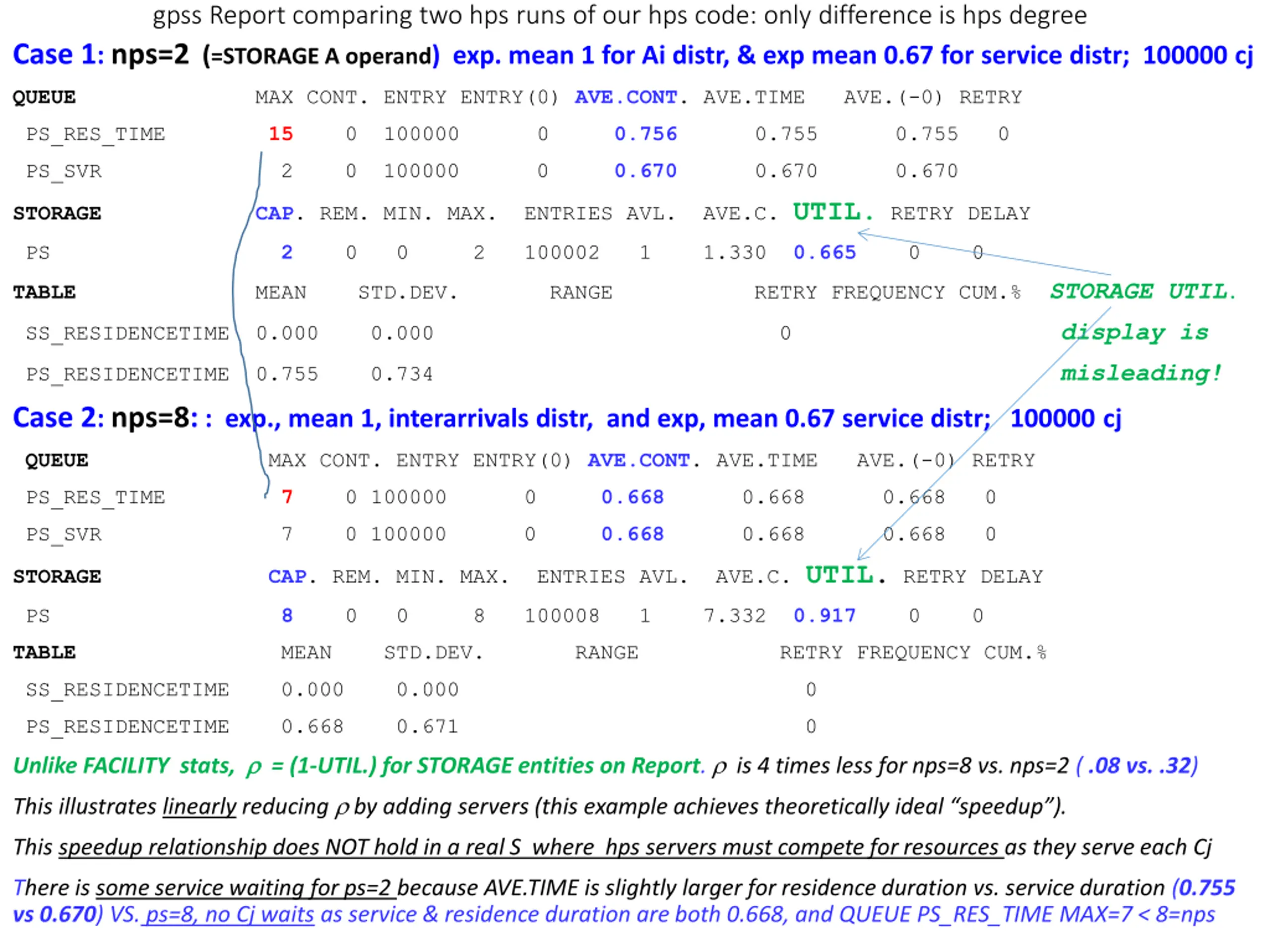 gpss Report comparing two hps runs of our hps code: only difference is hps degree Case 1: nps=2 (=STORAGE A operand) exp. mean 1 for Ai distr, & exp mean 0.67 for service distr; 100000 cj QUEUE MAX CONT. ENTRY ENTRY(0) AVE.CONT. AVE.TIME AVE.(-0) RETRY PS_RES_TIME 15 0 100000 0 0.756 0.755 0.755 0 PS_SVR 2 0 100000 0 0.670 0.670 0.670 STORAGECAP. REM. MIN. MAX. ENTRIES AVL. AVE.C. UTIL. RETRY DELAY PS 2 0 0 2 100002 1 1.330 0.665 0 0 TABLE MEAN STD.DEV. RANGE RETRY FREQUENCY CUM.% STORAGE UTIL. display is SS_RESIDENCETIME 0.000 0.000 0 misleading! PS_RESIDENCETIME 0.755 0.734 Case 2: nps=8: : exp., mean 1, interarrivals distr, and exp, mean 0.67 service distr; 100000 cj QUEUE MAX CONT. ENTRY ENTRY(0) AVE.CONT. AVE.TIME AVE.(-0) RETRY PS_RES_TIME 7 0 100000 0 0.668 0.668 0.668 0 PS_SVR 7 0 100000 0 0.668 0.668 0.668 0 STORAGECAP. REM. MIN. MAX. ENTRIES AVL. AVE.C. UTIL. RETRY DELAY PS 8 0 0 8 100008 1 7.332 0.917 0 0 TABLE MEAN STD.DEV. RANGE RETRY FREQUENCY CUM.% SS_RESIDENCETIME 0.000 0.000 0 PS_RESIDENCETIME 0.668 0.671 0 Unlike FACILITY stats, = (1-UTIL.) for STORAGE entities on Report. is 4 times less for nps=8 vs. nps=2 ( .08 vs. .32) This illustrates linearly reducing by adding servers (this example achieves theoretically ideal speedup ). This speedup relationship does NOT hold in a real S where hps servers must compete for resources as they serve each Cj There is some service waiting for ps=2 because AVE.TIME is slightly larger for residence duration vs. service duration (0.755 vs 0.670) VS. ps=8, no Cj waits as service & residence duration are both 0.668, and QUEUE PS_RES_TIME MAX=7 < 8=nps