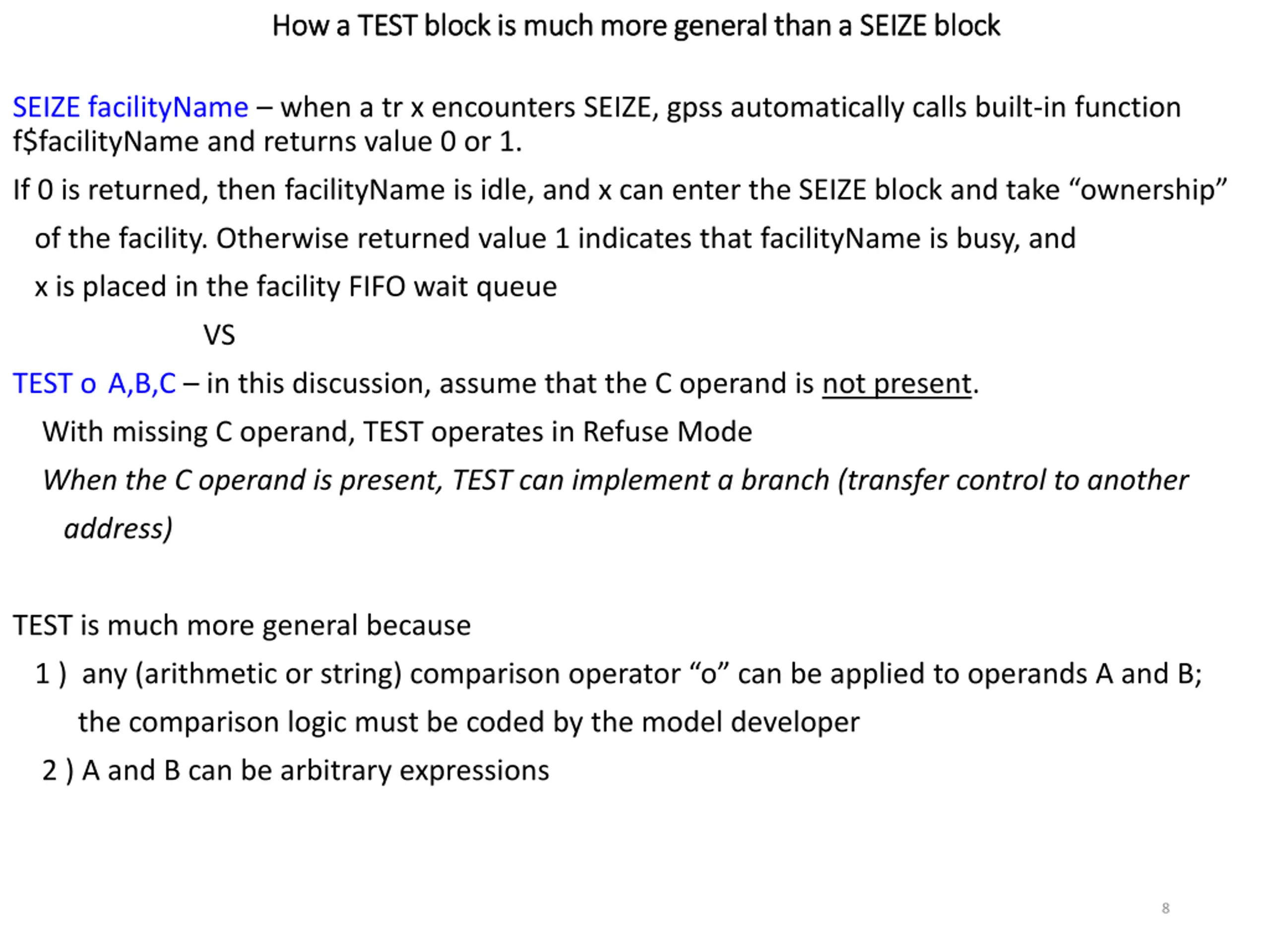 How a TEST block is much more general than a SEIZE block How a TEST block is much more general than a SEIZE block SEIZE facilityName when a tr x encounters SEIZE, gpss automatically calls built-in function f$facilityName and returns value 0 or 1. If 0 is returned, then facilityName is idle, and x can enter the SEIZE block and take ownership of the facility. Otherwise returned value 1 indicates that facilityName is busy, and x is placed in the facility FIFO wait queue VS TEST o A,B,C in this discussion, assume that the C operand is not present. With missing C operand, TEST operates in Refuse Mode When the C operand is present, TEST can implement a branch (transfer control to another address) TEST is much more general because 1 ) any (arithmetic or string) comparison operator o can be applied to operands A and B; the comparison logic must be coded by the model developer 2 ) A and B can be arbitrary expressions 8