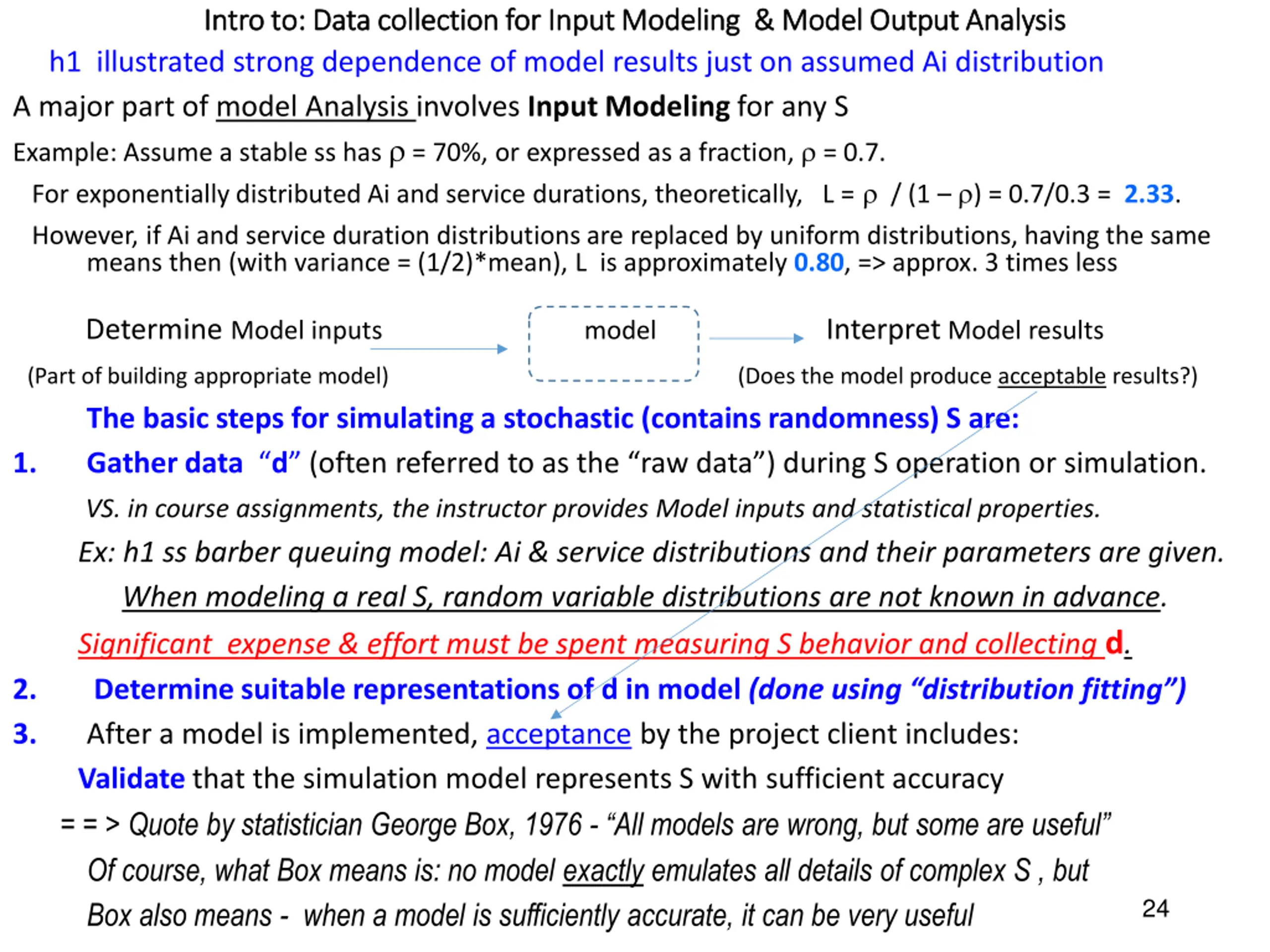 Intro to: Data collection for Input Modeling & Model Output Analysis Intro to: Data collection for Input Modeling & Model Output Analysis h1 illustrated strong dependence of model results just on assumed Ai distribution A major part of model Analysis involves Input Modeling for any S Example: Assume a stable ss has = 70%, or expressed as a fraction, = 0.7. For exponentially distributed Ai and service durations, theoretically, L = / (1 ) = 0.7/0.3 = 2.33. However, if Ai and service duration distributions are replaced by uniform distributions, having the same means then (with variance = (1/2)*mean), L is approximately 0.80, => approx. 3 times less Determine Model inputs (Part of building appropriate model) The basic steps for simulating a stochastic (contains randomness) S are: 1. Gather data d (often referred to as the raw data ) during S operation or simulation. VS. in course assignments, the instructor provides Model inputs and statistical properties. Ex: h1 ss barber queuing model: Ai & service distributions and their parameters are given. When modeling a real S, random variable distributions are not known in advance. Significant expense & effort must be spent measuring S behavior and collecting d. 2. Determine suitable representationsof d in model (done using distribution fitting ) 3. After a model is implemented, acceptance by the project client includes: Validate that the simulation model represents S with sufficient accuracy = = > Quote by statistician George Box, 1976 - All models are wrong, but some are useful Of course, what Box means is: no model exactly emulates all details of complex S , but Box also means - when a model is sufficiently accurate, it can be very useful Interpret Model results model (Does the model produce acceptable results?) 24