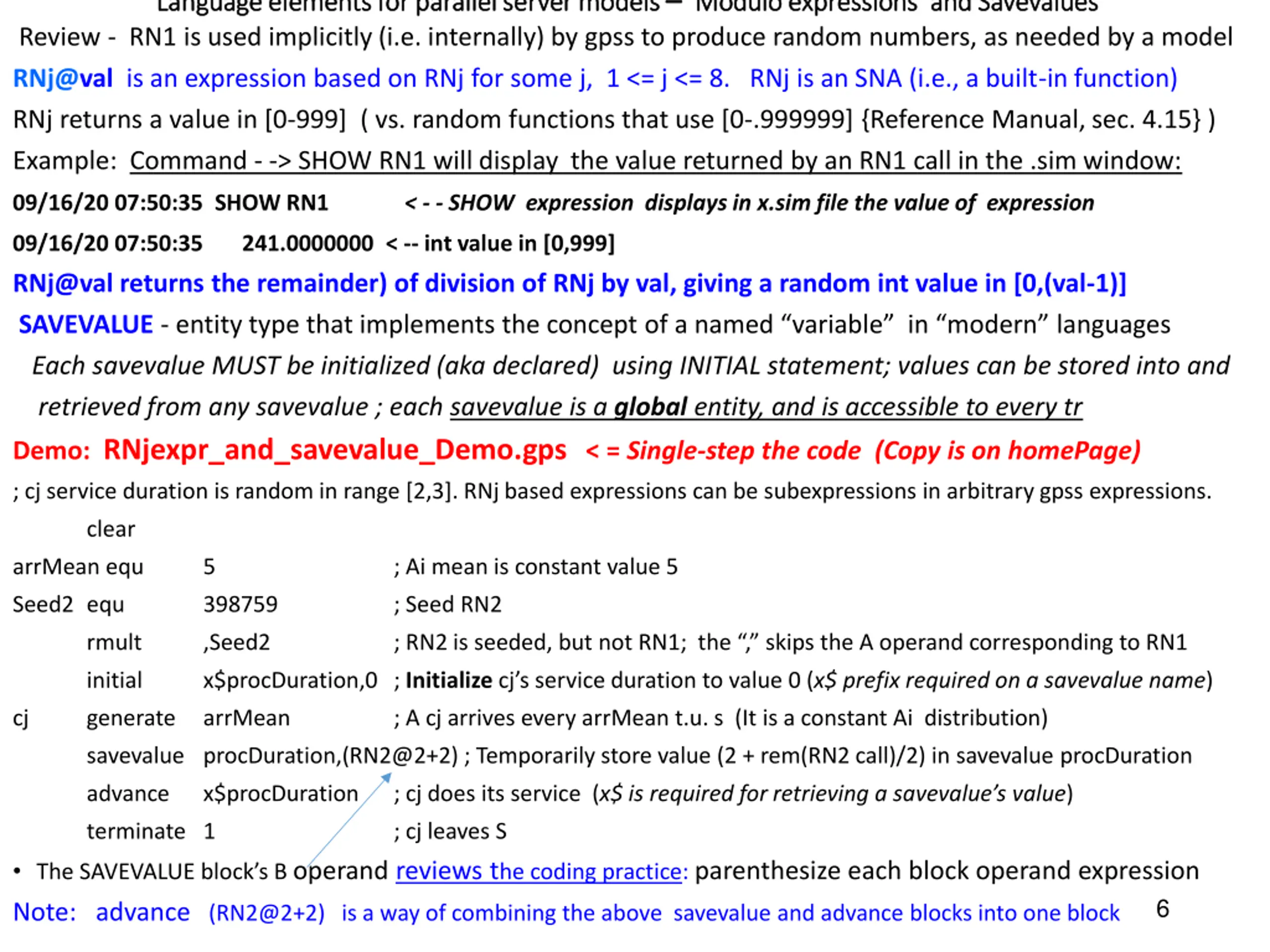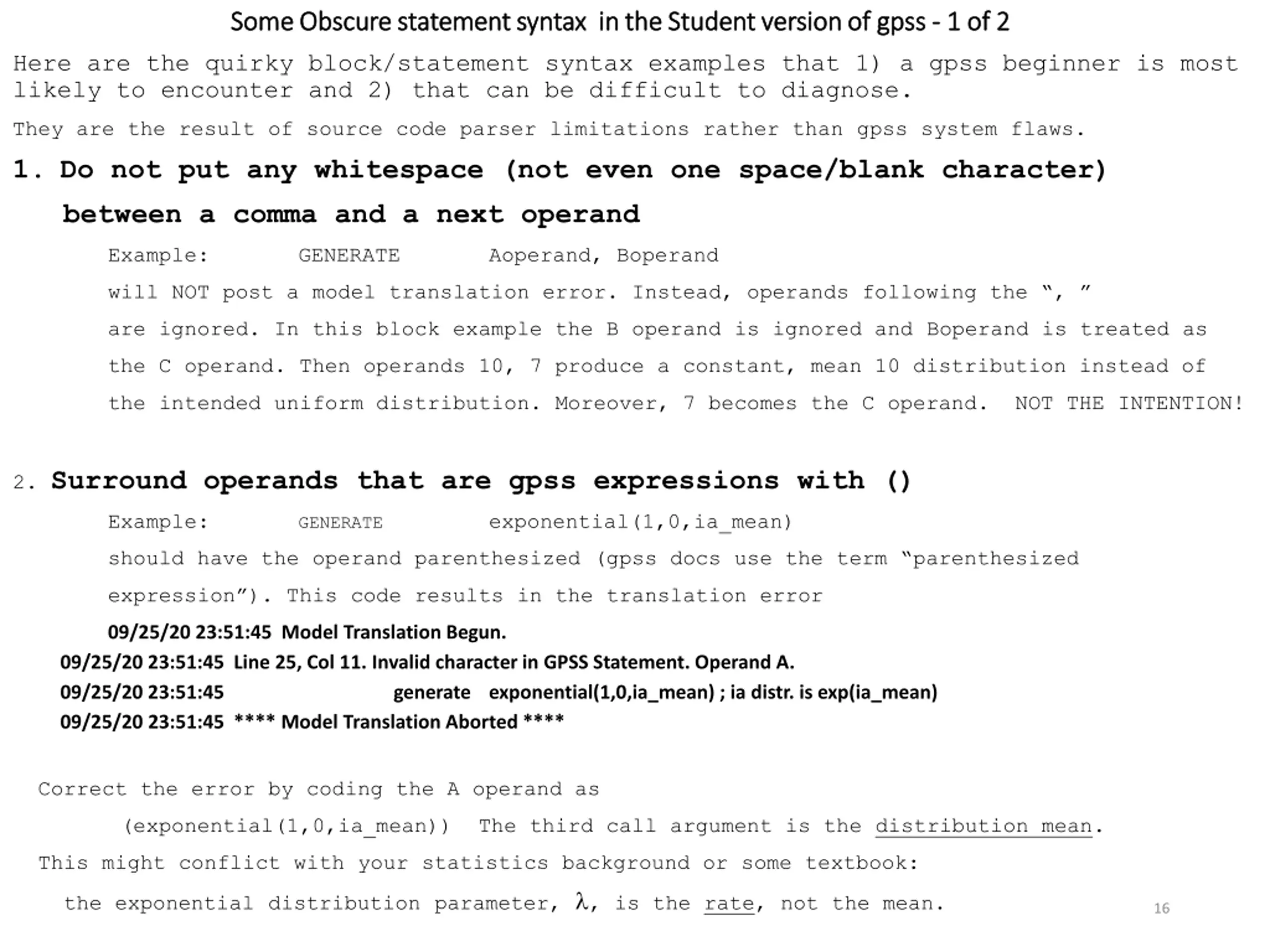 Some Obscure statement syntax in the Student version of gpss Some Obscure statement syntax in the Student version of gpss - - 1 of 2 1 of 2 Here are the quirky block/statement syntax examples that 1) a gpss beginner is most likely to encounter and 2) that can be difficult to diagnose. They are the result of source code parser limitations rather than gpss system flaws. 1. Do not put any whitespace (not even one space/blank character) between a comma and a next operand Example: GENERATE Aoperand, Boperand will NOT post a model translation error. Instead, operands following the , are ignored. In this block example the B operand is ignored and Boperand is treated as the C operand. Then operands 10, 7 produce a constant, mean 10 distribution instead of the intended uniform distribution. Moreover, 7 becomes the C operand. NOT THE INTENTION! 2. Surround operands that are gpss expressions with () Example: GENERATE exponential(1,0,ia_mean) should have the operand parenthesized (gpss docs use the term parenthesized expression ). This code results in the translation error 09/25/20 23:51:45 Model Translation Begun. 09/25/20 23:51:45 Line 25, Col 11. Invalid character in GPSS Statement. Operand A. 09/25/20 23:51:45 generate exponential(1,0,ia_mean) ; ia distr. is exp(ia_mean) 09/25/20 23:51:45 **** Model Translation Aborted **** Correct the error by coding the A operand as (exponential(1,0,ia_mean)) The third call argument is the distribution mean. This might conflict with your statistics background or some textbook: the exponential distribution parameter, , is the rate, not the mean. 16