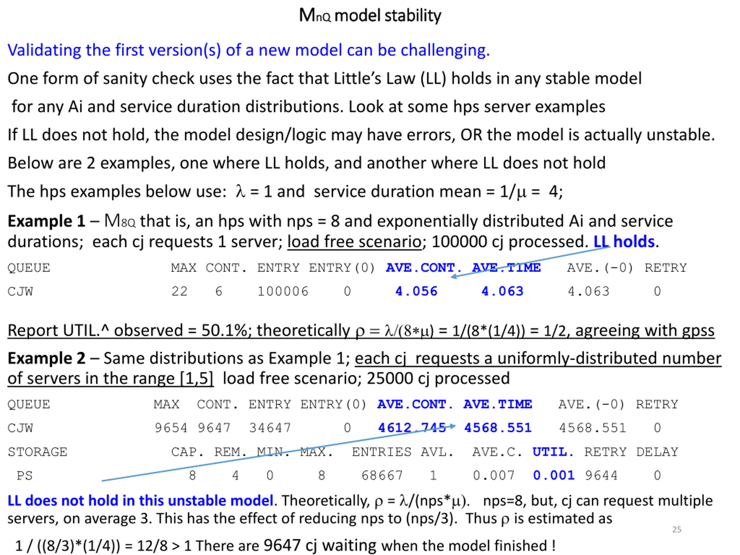 M MnQ nQ model stability model stability Validating the first version(s) of a new model can be challenging. One form of sanity check uses the fact that Little s Law (LL) holds in any stable model for any Ai and service duration distributions. Look at some hps server examples If LL does not hold, the model design/logic may have errors, OR the model is actually unstable. Below are 2 examples, one where LL holds, and another where LL does not hold The hps examples below use: = 1 and service duration mean = 1/ = 4; Example 1 M8Q that is, an hps with nps = 8 and exponentially distributed Ai and service durations; each cj requests 1 server; load free scenario; 100000 cj processed. LL holds. QUEUE MAX CONT. ENTRY ENTRY(0) AVE.CONT. AVE.TIME AVE.(-0) RETRY CJW 22 6 100006 0 4.056 4.063 4.063 0 Report UTIL.^ observed = 50.1%; theoretically = ( ) = 1/(8*(1/4)) = 1/2, agreeing with gpss Example 2 Same distributions as Example 1; each cj requests a uniformly-distributed number of servers in the range [1,5] load free scenario; 25000 cj processed QUEUE MAX CONT. ENTRY ENTRY(0) AVE.CONT. AVE.TIME AVE.(-0) RETRY CJW 9654 9647 34647 0 4612.745 4568.551 4568.551 0 STORAGE CAP. REM. MIN. MAX. ENTRIES AVL. AVE.C. UTIL. RETRY DELAY PS 8 4 0 8 68667 1 0.007 0.001 9644 0 LL does not hold in this unstable model. Theoretically, = /(nps* ) nps=8, but, cj can request multiple servers, on average 3. This has the effect of reducing nps to (nps/3). Thus is estimated as 25 1 / ((8/3)*(1/4)) = 12/8 > 1 There are 9647 cj waiting when the model finished !