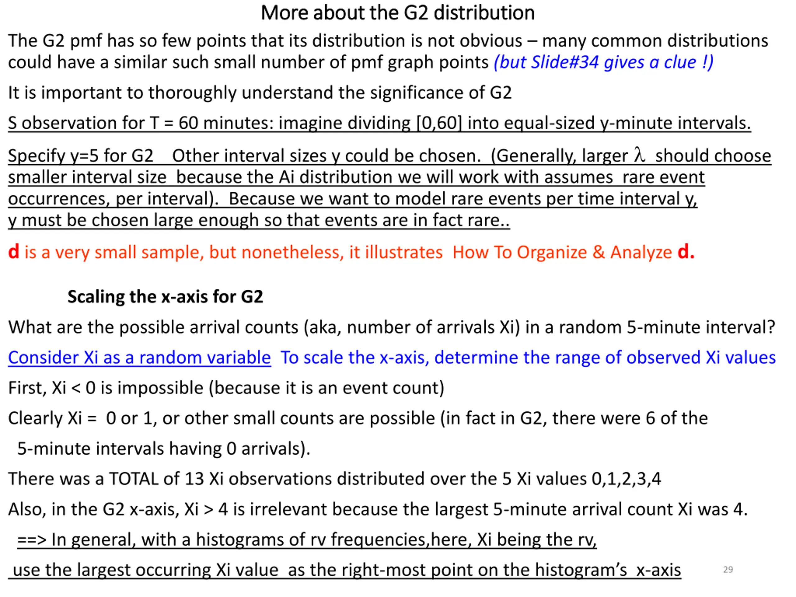More about the G2 distribution More about the G2 distribution The G2 pmf has so few points that its distribution is not obvious many common distributions could have a similar such small number of pmf graph points (but Slide#34 gives a clue !) It is important to thoroughly understand the significance of G2 S observation for T = 60 minutes: imagine dividing [0,60] into equal-sized y-minute intervals. Specify y=5 for G2 Other interval sizes y could be chosen. (Generally, larger should choose smaller interval size because the Ai distribution we will work with assumes rare event occurrences, per interval). Because we want to model rare events per time interval y, y must be chosen large enough so that events are in fact rare.. d is a very small sample, but nonetheless, it illustrates How To Organize & Analyze d. Scaling the x-axis for G2 What are the possible arrival counts (aka, number of arrivals Xi) in a random 5-minute interval? Consider Xi as a random variable To scale the x-axis, determine the range of observed Xi values First, Xi < 0 is impossible (because it is an event count) Clearly Xi = 0 or 1, or other small counts are possible (in fact in G2, there were 6 of the 5-minute intervals having 0 arrivals). There was a TOTAL of 13 Xi observations distributed over the 5 Xi values 0,1,2,3,4 Also, in the G2 x-axis, Xi > 4 is irrelevant because the largest 5-minute arrival count Xi was 4. ==> In general, with a histograms of rv frequencies,here, Xi being the rv, use the largest occurring Xi value as the right-most point on the histogram s x-axis 29
