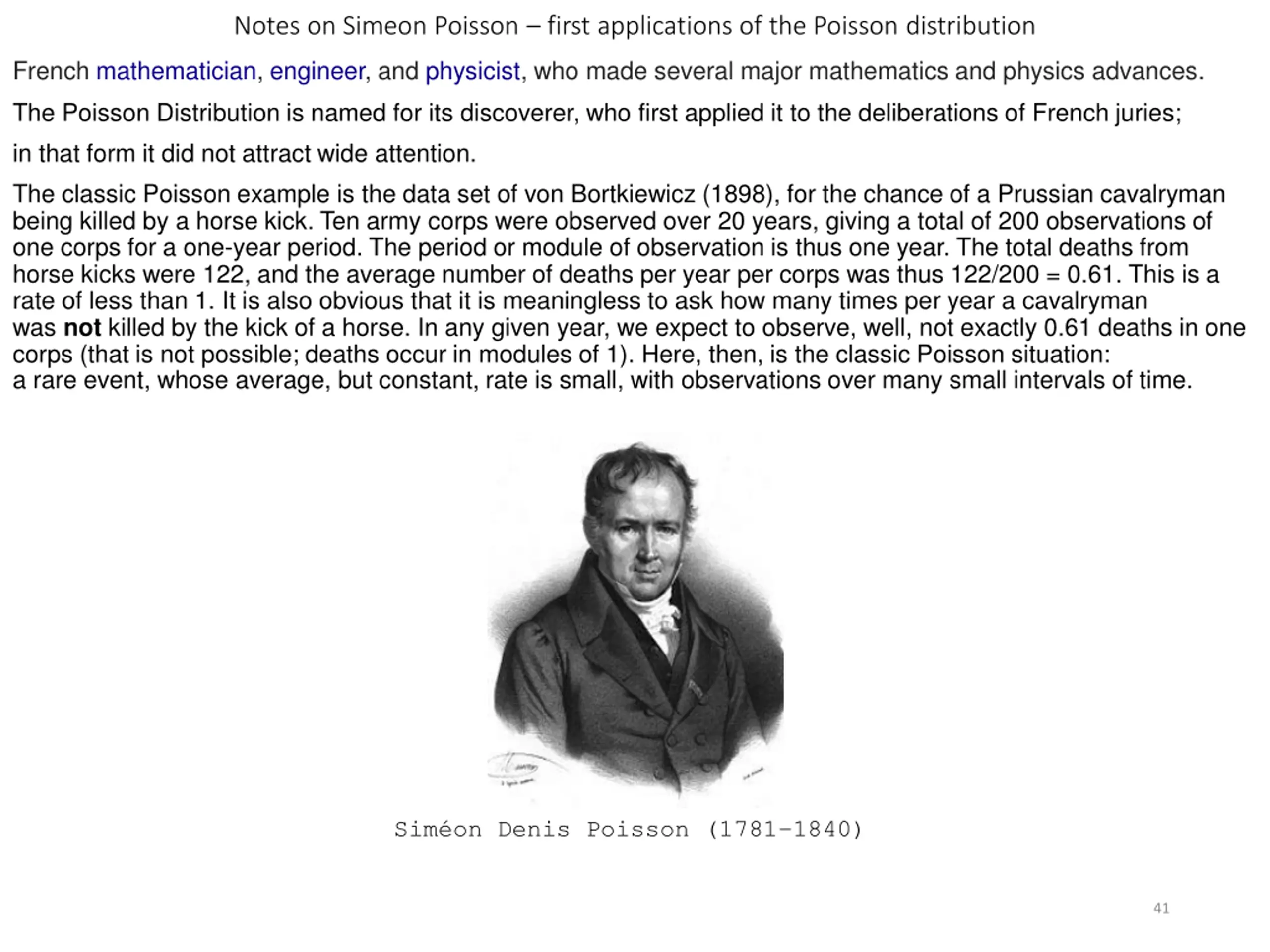 Notes on Simeon Poisson first applications of the Poisson distribution French mathematician, engineer, and physicist, who made several major mathematics and physics advances. The Poisson Distribution is named for its discoverer, who first applied it to the deliberations of French juries; in that form it did not attract wide attention. The classic Poisson example is the data set of von Bortkiewicz (1898), for the chance of a Prussian cavalryman being killed by a horse kick. Ten army corps were observed over 20 years, giving a total of 200 observations of one corps for a one-year period. The period or module of observation is thus one year. The total deaths from horse kicks were 122, and the average number of deaths per year per corps was thus 122/200 = 0.61. This is a rate of less than 1. It is also obvious that it is meaningless to ask how many times per year a cavalryman was not killed by the kick of a horse. In any given year, we expect to observe, well, not exactly 0.61 deaths in one corps (that is not possible; deaths occur in modules of 1). Here, then, is the classic Poisson situation: a rare event, whose average, but constant, rate is small, with observations over many small intervals of time. Sim on Denis Poisson (1781 1840) 41