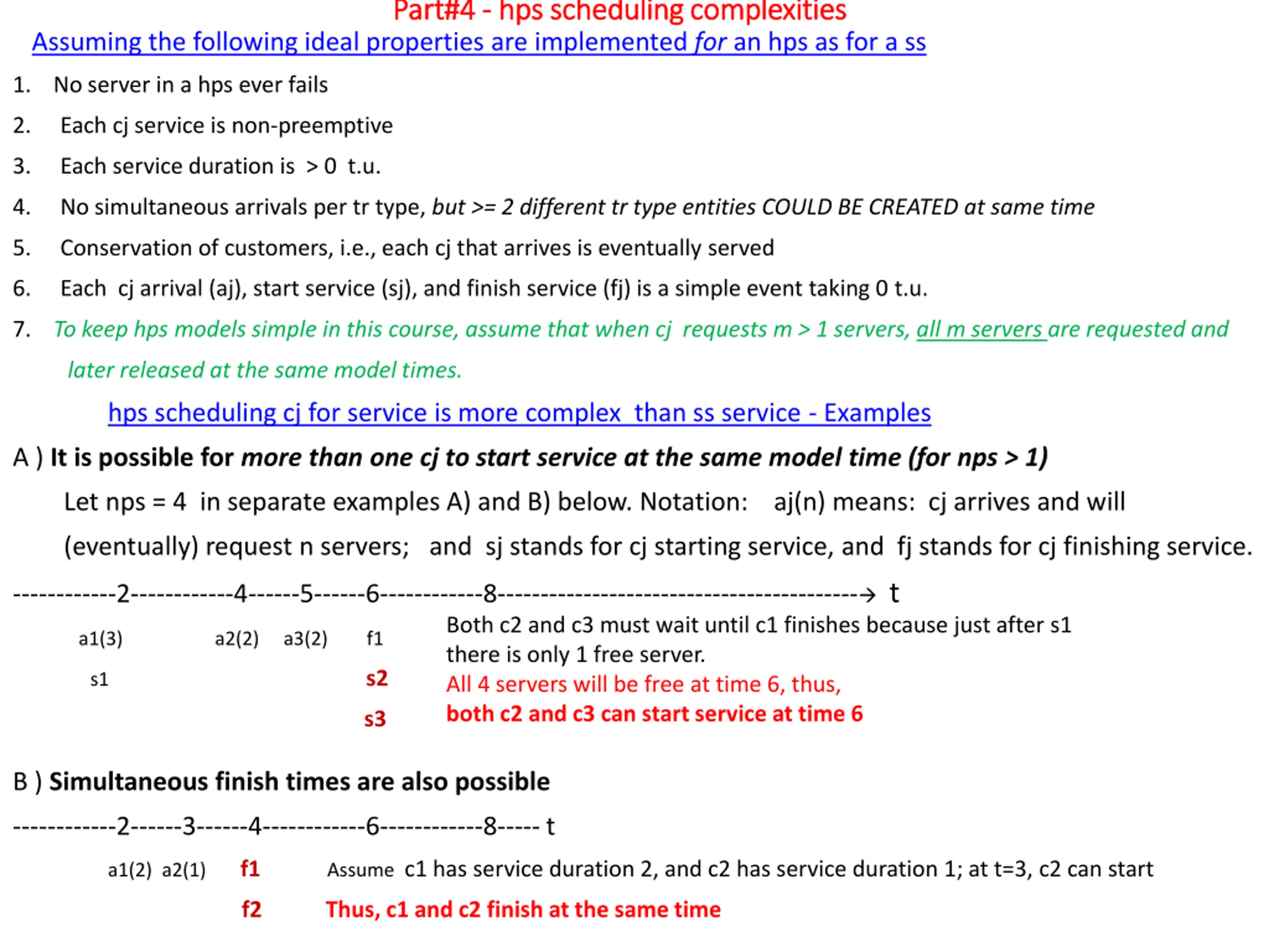 Part#4 Part#4 - - hps hps scheduling complexities scheduling complexities Assuming the following ideal properties are implemented for an hps as for a ss 1. No server in a hps ever fails 2. Each cj service is non-preemptive 3. Each service duration is > 0 t.u. 4. No simultaneous arrivals per tr type, but >= 2 different tr type entities COULD BE CREATED at same time 5. Conservation of customers, i.e., each cj that arrives is eventually served 6. Each cj arrival (aj), start service (sj), and finish service (fj) is a simple event taking 0 t.u. 7. To keep hps models simple in this course, assume that when cj requests m > 1 servers, all m servers are requested and later released at the same model times. hps scheduling cj for service is more complex than ss service - Examples A ) It is possible for more than one cj to start service at the same model time (for nps > 1) Let nps = 4 in separate examples A) and B) below. Notation: aj(n) means: cj arrives and will (eventually) request n servers; and sj stands for cj starting service, and fj stands for cj finishing service. ------------2------------4------5------6------------8------------------------------------------ t Both c2 and c3 must wait until c1 finishes because just after s1 there is only 1 free server. All 4 servers will be free at time 6, thus, both c2 and c3 can start service at time 6 a1(3) a2(2) a3(2) f1 s2 s1 s3 B ) Simultaneous finish times are also possible ------------2------3------4------------6------------8----- t a1(2) a2(1) f1 Assume c1 has service duration 2, and c2 has service duration 1; at t=3, c2 can start f2 Thus, c1 and c2 finish at the same time