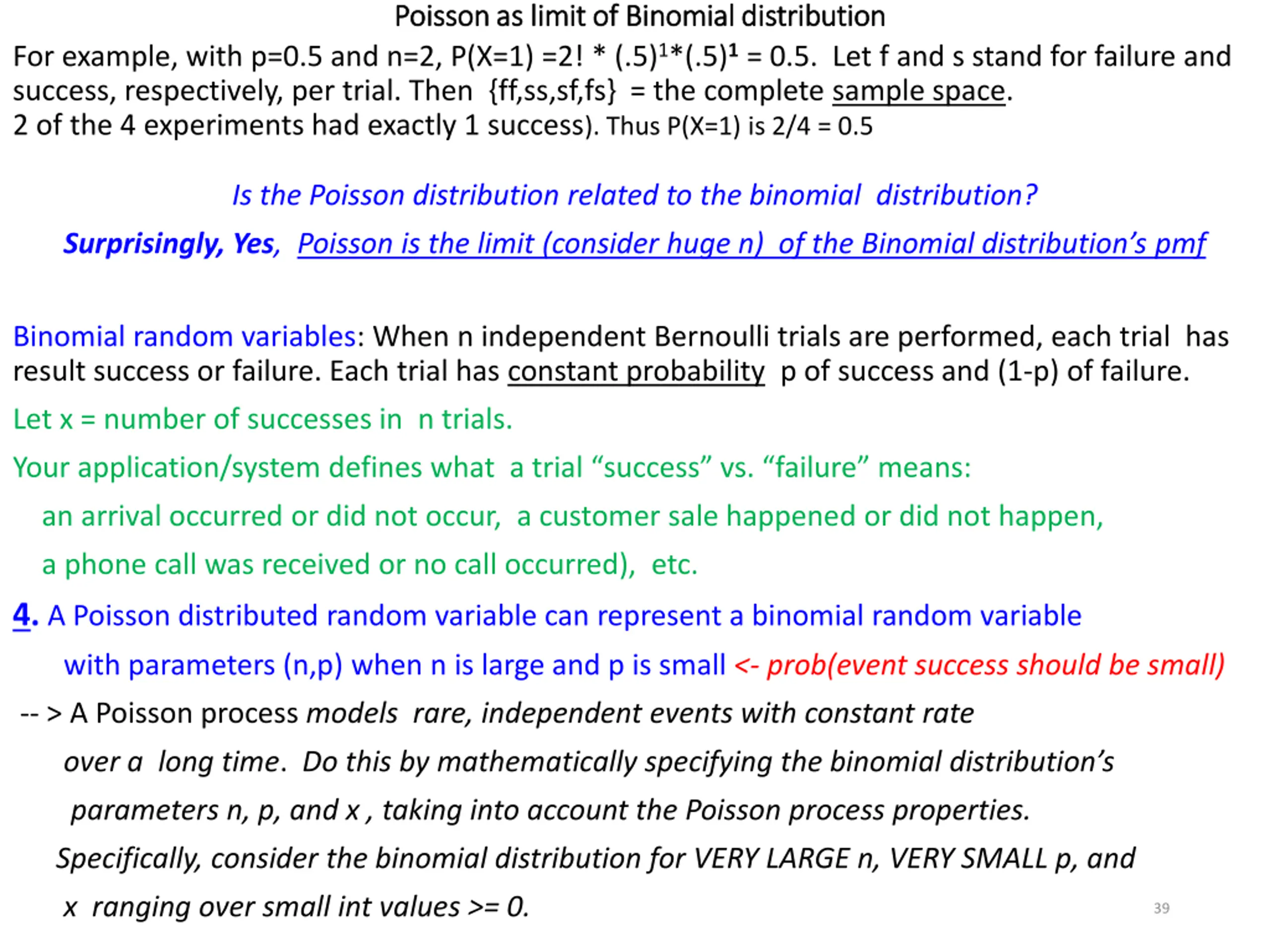 Poisson as limit of Binomial distribution Poisson as limit of Binomial distribution For example, with p=0.5 and n=2, P(X=1) =2! * (.5)1*(.5)1 = 0.5. Let f and s stand for failure and success, respectively, per trial. Then {ff,ss,sf,fs} = the complete sample space. 2 of the 4 experiments had exactly 1 success). Thus P(X=1) is 2/4 = 0.5 Is the Poisson distribution related to the binomial distribution? Surprisingly, Yes, Poisson is the limit (consider huge n) of the Binomial distribution s pmf Binomial random variables: When n independent Bernoulli trials are performed, each trial has result success or failure. Each trial has constant probability p of success and (1-p) of failure. Let x = number of successes in n trials. Your application/system defines what a trial success vs. failure means: an arrival occurred or did not occur, a customer sale happened or did not happen, a phone call was received or no call occurred), etc. 4. A Poisson distributed random variable can represent a binomial random variable with parameters (n,p) when n is large and p is small <- prob(event success should be small) -- > A Poisson process models rare, independent events with constant rate over a long time. Do this by mathematically specifying the binomial distribution s parameters n, p, and x , taking into account the Poisson process properties. Specifically, consider the binomial distribution for VERY LARGE n, VERY SMALL p, and x ranging over small int values >= 0. 39