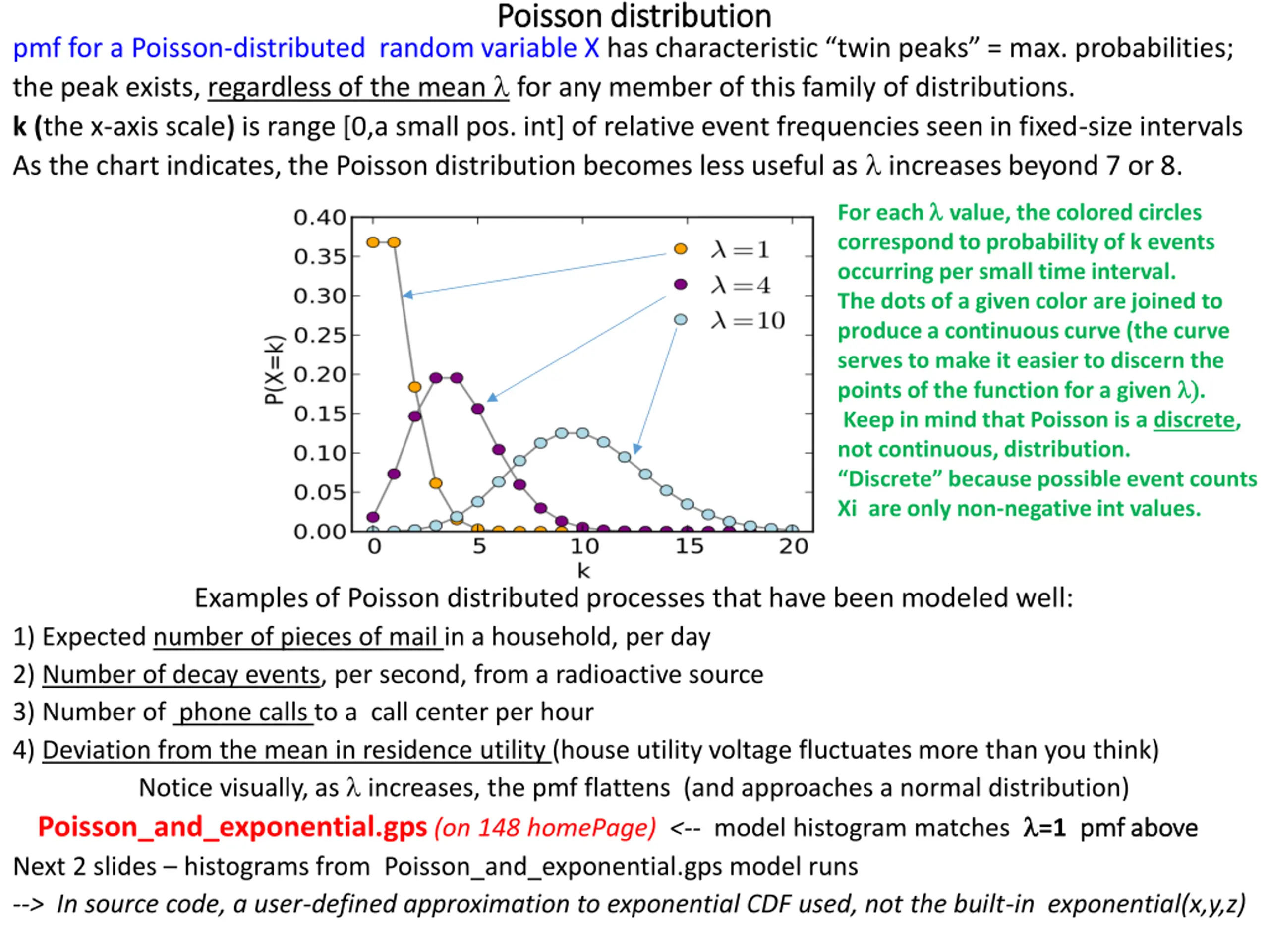 Poisson distribution Poisson distribution pmf for a Poisson-distributed random variable X has characteristic twin peaks = max. probabilities; the peak exists, regardless of the mean for any member of this family of distributions. k (the x-axis scale) is range [0,a small pos. int] of relative event frequencies seen in fixed-size intervals As the chart indicates, the Poisson distribution becomes less useful as increases beyond 7 or 8. For each value, the colored circles correspond to probability of k events occurring per small time interval. The dots of a given color are joined to produce a continuous curve (the curve serves to make it easier to discern the points of the function for a given ) ). Keep in mind that Poisson is a discrete, not continuous, distribution. Discrete because possible event counts Xi are only non-negative int values. Examples of Poisson distributed processes that have been modeled well: 1) Expected number of pieces of mail in a household, per day 2) Number of decay events, per second, from a radioactive source 3) Number of phone calls to a call center per hour 4) Deviation from the mean in residence utility (house utility voltage fluctuates more than you think) Notice visually, as increases, the pmf flattens (and approaches a normal distribution) Poisson_and_exponential.gps(on 148 homePage) <-- model histogram matches =1 pmf above Next 2 slides histograms from Poisson_and_exponential.gps model runs --> In source code, a user-defined approximation to exponential CDF used, not the built-in exponential(x,y,z) pmf above