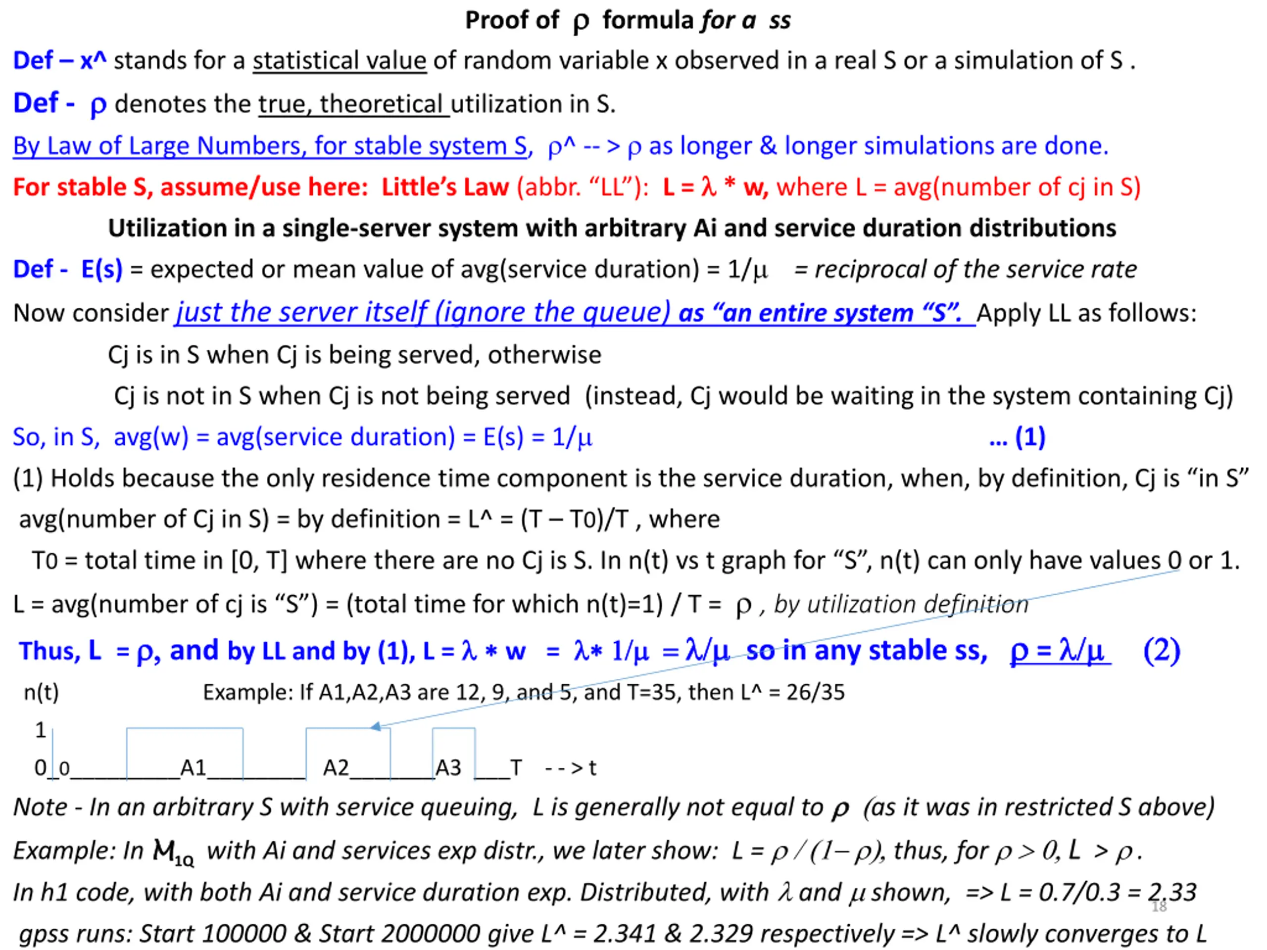 Proof of formula for a ss Def x^ stands for a statistical value of random variable x observed in a real S or a simulation of S . Def - denotes the true, theoretical utilization in S. By Law of Large Numbers, for stable system S, ^ -- > as longer & longer simulations are done. For stable S, assume/use here: Little s Law (abbr. LL ): L = * w, where L = avg(number of cj in S) Utilization in a single-server system with arbitrary Ai and service duration distributions Def - E(s) = expected or mean value of avg(service duration) = 1/ = reciprocal of the service rate Now consider just the server itself (ignore the queue) as an entire system S . Apply LL as follows: Cj is in S when Cj is being served, otherwise Cj is not in S when Cj is not being served (instead, Cj would be waiting in the system containing Cj) So, in S, avg(w) = avg(service duration) = E(s) = 1/ (1) Holds because the only residence time component is the service duration, when, by definition, Cj is in S avg(number of Cj in S) = by definition = L^ = (T T0)/T , where T0= total time in [0, T] where there are no Cj is S. In n(t) vs t graph for S , n(t) can only have values 0 or 1. L = avg(number of cj is S ) = (total time for which n(t)=1) / T = , by utilization definition Thus, L = andby LL and by (1), L = w = = = so in any stable ss, = (1) ( ( ) ) n(t) Example: If A1,A2,A3 are 12, 9, and 5, and T=35, then L^ = 26/35 1 0_0_________A1________ A2_______A3 ___T - - > t Note - In an arbitrary S with service queuing, L is generally not equal to (as it was in restricted S above) Example: In M M1Q with Ai and services exp distr., we later show: L = ( ) thus, for L > . In h1 code, with both Ai and service duration exp. Distributed, with and shown, => L = 0.7/0.3 = 2.33 gpss runs: Start 100000 & Start 2000000 give L^ = 2.341 & 2.329 respectively => L^ slowly converges to L 18