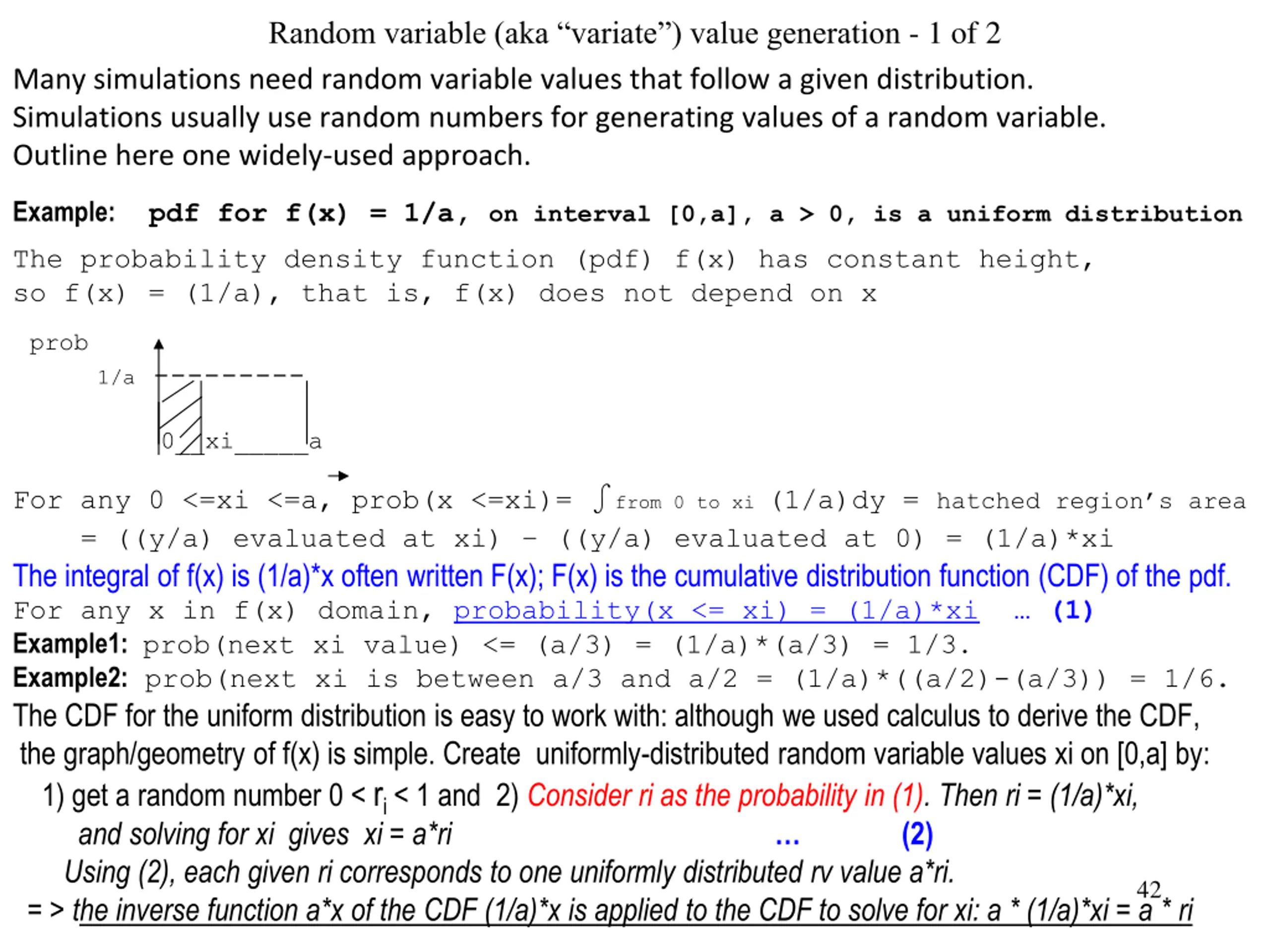 Random variable (aka variate) value generation - 1 of 2 Many simulations need random variable values that follow a given distribution. Simulations usually use random numbers for generating values of a random variable. Outline here one widely-used approach. Example:pdf for f(x) = 1/a, on interval [0,a], a > 0, is a uniform distribution The probability density function (pdf) f(x) has constant height, so f(x) = (1/a), that is, f(x) does not depend on x prob 1/a --------- 0__xi_____a For any 0 <=xi <=a, prob(x <=xi)= from 0 to xi (1/a)dy = hatched region s area = ((y/a) evaluated at xi) ((y/a) evaluated at 0) = (1/a)*xi The integral of f(x) is (1/a)*x often written F(x); F(x) is the cumulative distribution function (CDF) of the pdf. For any x in f(x) domain, probability(x <= xi) = (1/a)*xi (1) Example1:prob(next xi value) <= (a/3) = (1/a)*(a/3) = 1/3. Example2: prob(next xi is between a/3 and a/2 = (1/a)*((a/2)-(a/3)) = 1/6. The CDF for the uniform distribution is easy to work with: although we used calculus to derive the CDF, the graph/geometry of f(x) is simple. Create uniformly-distributed random variable values xi on [0,a] by: 1) get a random number 0 < ri< 1 and 2) Consider ri as the probability in (1). Then ri = (1/a)*xi, and solving for xi gives xi = a*ri Using (2), each given ri corresponds to one uniformly distributed rv value a*ri. = > the inverse function a*x of the CDF (1/a)*x is applied to the CDF to solve for xi: a * (1/a)*xi = a * ri (2) 42