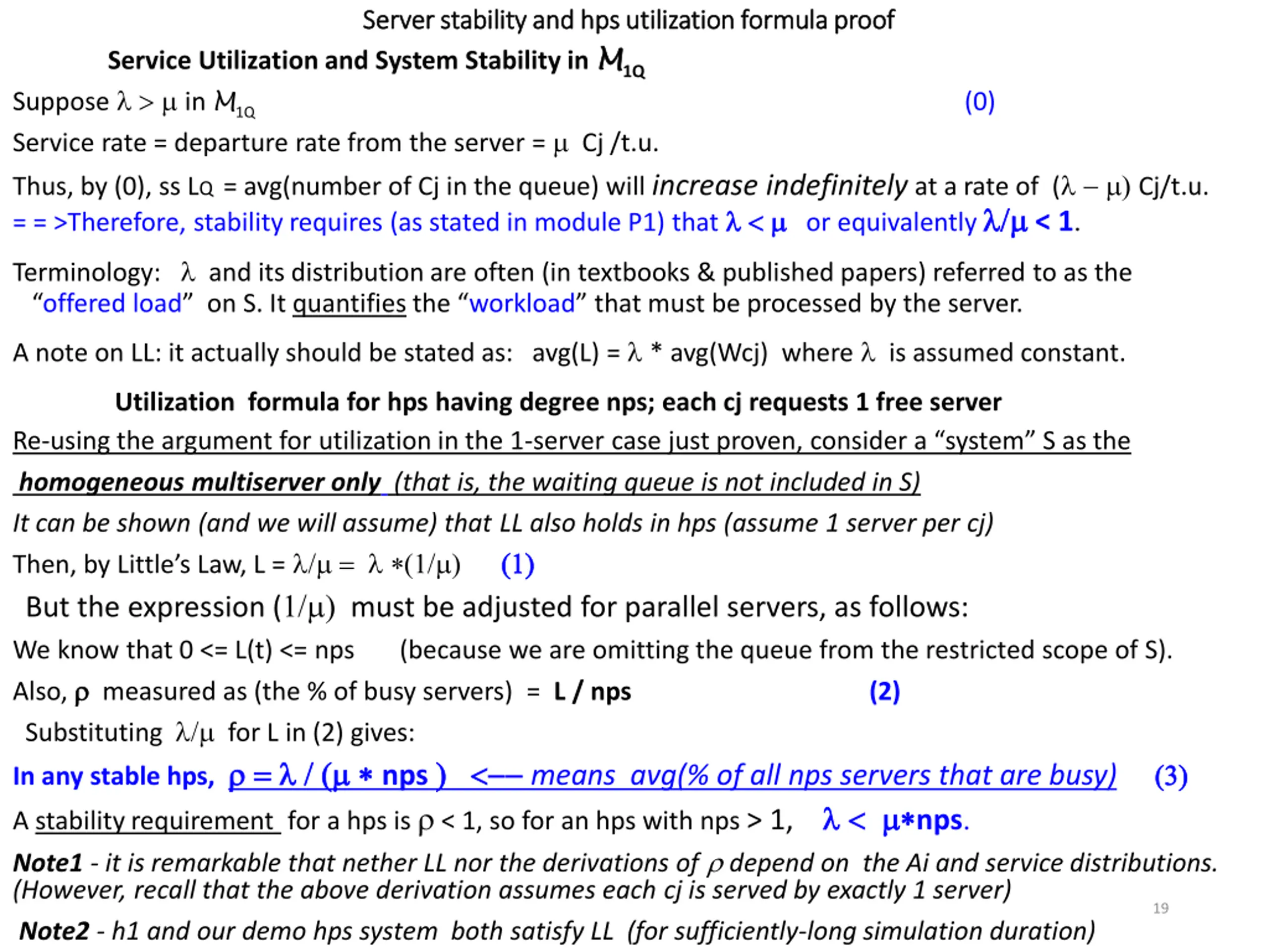 S Server erver stability and stability and hps hps utilization formula proof utilization formula proof M1Q Service Utilization and System Stability in M Suppose in M1Q Service rate = departure rate from the server = Cj /t.u. Thus, by (0), ss LQ = avg(number of Cj in the queue) will increase indefinitely at a rate of ( ) Cj/t.u. = = >Therefore, stability requires (as stated in module P1) that or equivalently < 1. Terminology: and its distribution are often (in textbooks & published papers) referred to as the offered load on S. It quantifies the workload that must be processed by the server. A note on LL: it actually should be stated as: avg(L) = * avg(Wcj) where is assumed constant. Utilization formula for hps having degree nps; each cj requests 1 free server Re-using the argument for utilization in the 1-server case just proven, consider a system S as the homogeneous multiserver only (that is, the waiting queue is not included in S) It can be shown (and we will assume) thatLL also holds in hps (assume 1 server per cj) Then, by Little s Law, L = = ( ) ( ( ) ) But the expression ( ) must be adjusted for parallel servers, as follows: We know that 0 <= L(t) <= nps (because we are omitting the queue from the restricted scope of S). Also, measured as (the % of busy servers) = L / nps Substituting for L in (2) gives: In any stable hps, = = ( ( nps ) ) means avg(% of all nps serversthat are busy) A stability requirement for a hps is < 1, so for an hps with nps > 1, nps Note1 - it is remarkable that nether LL nor the derivations of depend on the Ai and service distributions. (However, recall that the above derivation assumes each cj is served by exactly 1 server) Note2 - h1 and our demo hps system both satisfy LL (for sufficiently-long simulation duration) (0) (2) ( ( ) ) 19