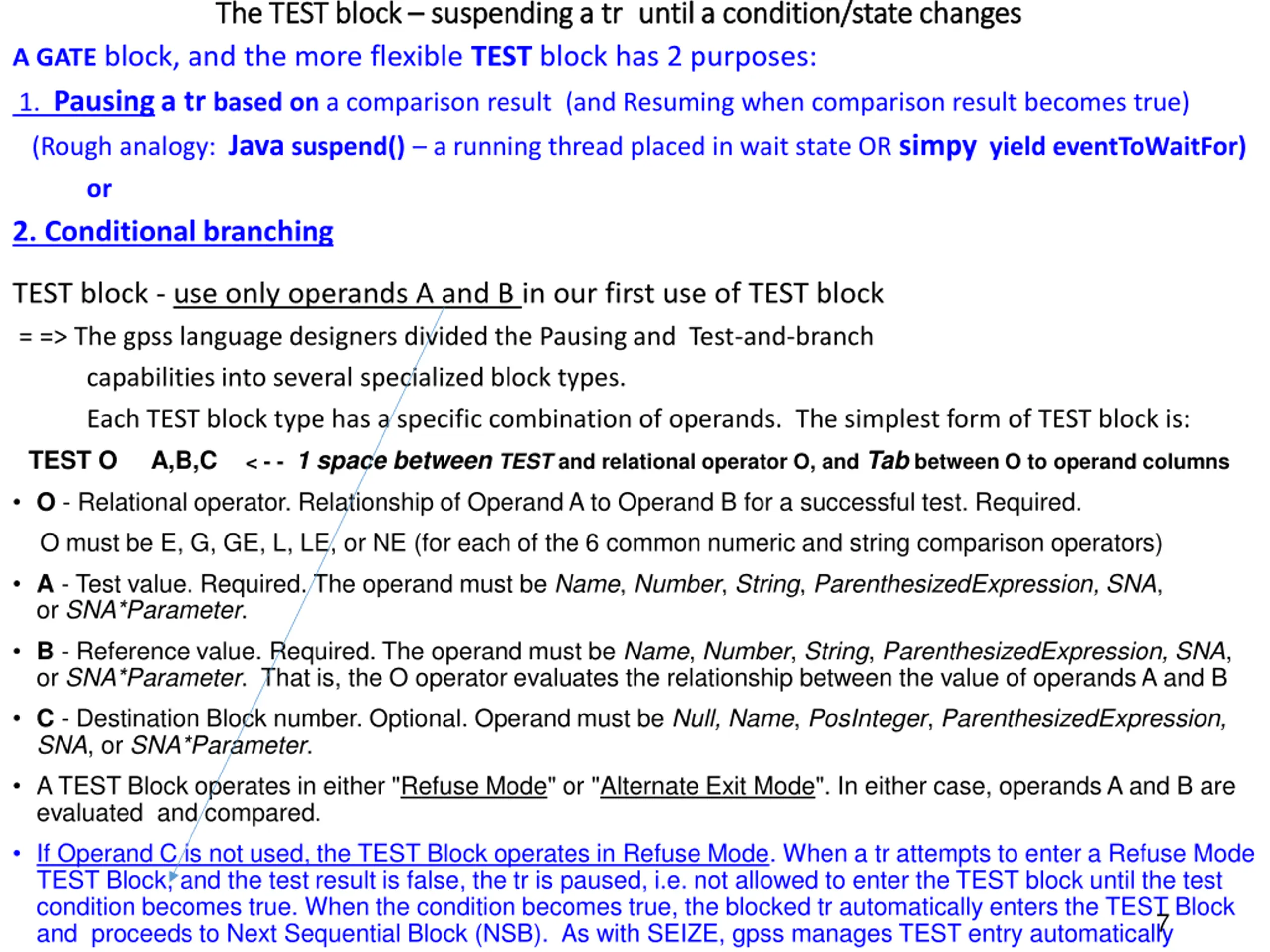 suspending a truntil a condition/state changes until a condition/state changes The TEST block The TEST block suspending a tr A GATE block, and the more flexible TEST block has 2 purposes: 1. Pausinga tr based on a comparison result (and Resuming when comparison result becomes true) (Rough analogy: Java suspend() a running thread placed in wait state OR simpy yield eventToWaitFor) or 2. Conditional branching TEST block - use only operands A and B in our first use of TEST block = => The gpss language designers divided the Pausing and Test-and-branch capabilities into several specialized block types. Each TEST block type has a specific combination of operands. The simplest form of TEST block is: TEST O A,B,C < - - 1 space between TEST and relational operator O, and Tab between O to operand columns O - Relational operator. Relationship of Operand A to Operand B for a successful test. Required. O must be E, G, GE, L, LE, or NE (for each of the 6 common numeric and string comparison operators) A - Test value. Required. The operand must be Name, Number, String, ParenthesizedExpression, SNA, or SNA*Parameter. B - Reference value. Required. The operand must be Name, Number, String, ParenthesizedExpression, SNA, or SNA*Parameter. That is, the O operator evaluates the relationship between the value of operands A and B C - Destination Block number. Optional. Operand must be Null, Name, PosInteger, ParenthesizedExpression, SNA, or SNA*Parameter. A TEST Block operates in either "Refuse Mode" or "Alternate Exit Mode". In either case, operands A and B are evaluated and compared. If Operand C is not used, the TEST Block operates in Refuse Mode. When a tr attempts to enter a Refuse Mode TEST Block, and the test result is false, the tr is paused, i.e. not allowed to enter the TEST block until the test condition becomes true. When the condition becomes true, the blocked tr automatically enters the TEST Block and proceeds to Next Sequential Block (NSB). As with SEIZE, gpss manages TEST entry automatically 7