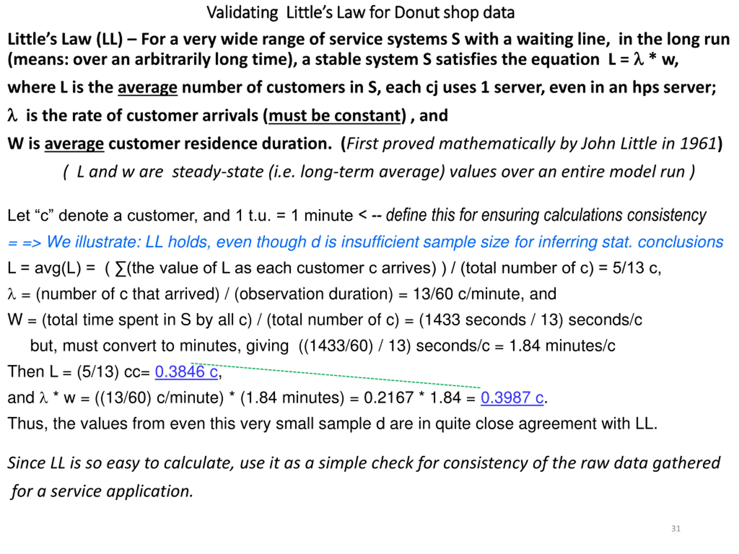 Validating Littles Law for Donut shop data Validating Little s Law for Donut shop data Little s Law (LL) For a very wide range of service systems S with a waiting line, in the long run (means: over an arbitrarily long time), a stable system S satisfies the equation L = * w, where L is the average number of customers in S, each cj uses 1 server, even in an hps server; is the rate of customer arrivals (must be constant) , and W is average customer residence duration. (First proved mathematically by John Little in 1961) ( L and w are steady-state (i.e. long-term average) values over an entire model run ) Let c denote a customer, and 1 t.u. = 1 minute < -- define this for ensuring calculations consistency = => We illustrate: LL holds, even though d is insufficient sample size for inferring stat. conclusions L = avg(L) = ( (the value of L as each customer c arrives) ) / (total number of c) = 5/13 c, = (number of c that arrived) / (observation duration) = 13/60 c/minute, and W = (total time spent in S by all c) / (total number of c) = (1433 seconds / 13) seconds/c but, must convert to minutes, giving ((1433/60) / 13) seconds/c = 1.84 minutes/c Then L = (5/13) cc= 0.3846 c, and * w = ((13/60) c/minute) * (1.84 minutes) = 0.2167 * 1.84 = 0.3987 c. Thus, the values from even this very small sample d are in quite close agreement with LL. Since LL is so easy to calculate, use it as a simple check for consistency of the raw data gathered for a service application. 31