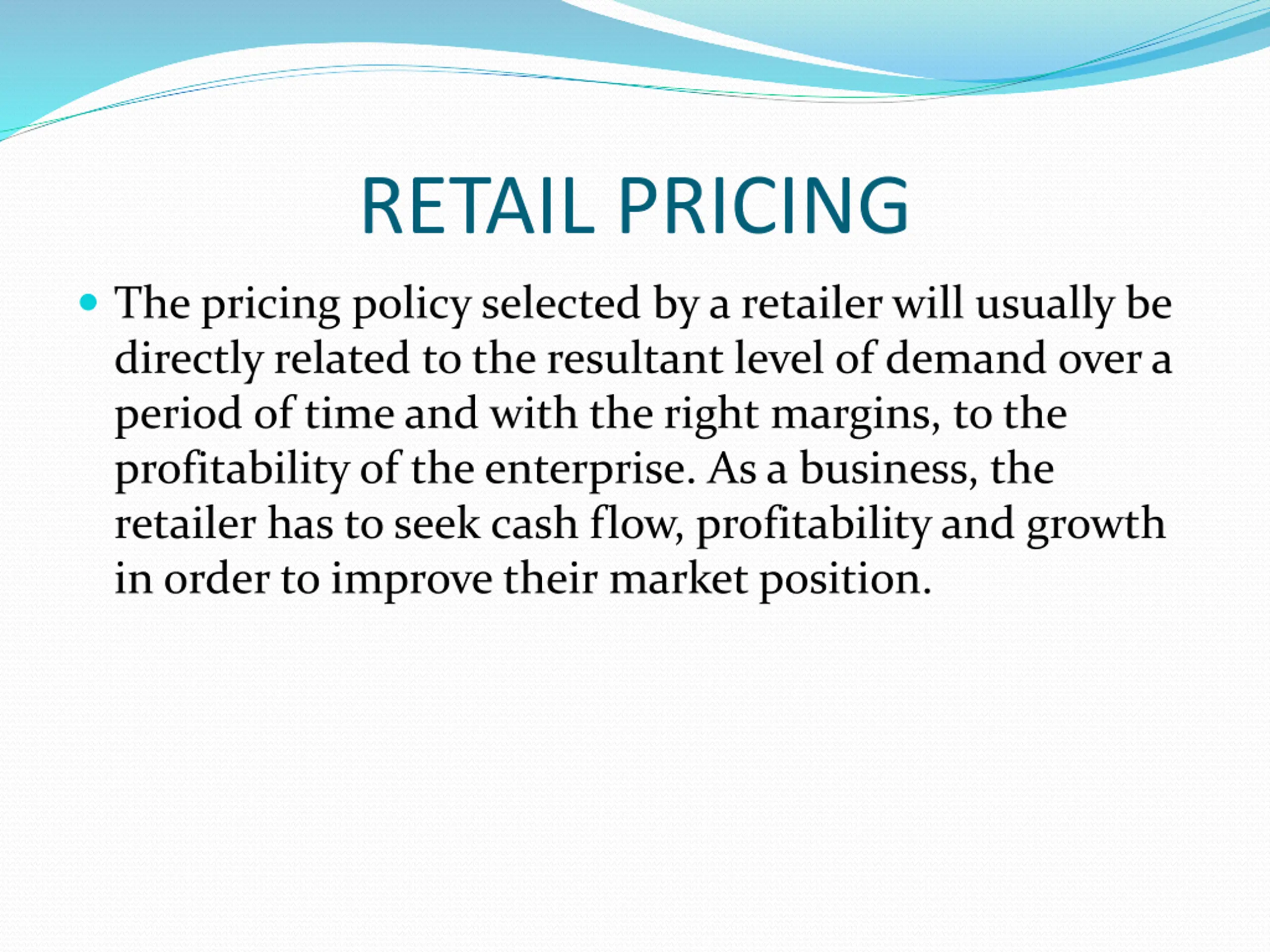 RETAIL PRICING The pricing policy selected by a retailer will usually be directly related to the resultant level of demand over a period of time and with the right margins, to the profitability of the enterprise. As a business, the retailer has to seek cash flow, profitability and growth in order to improve their market position.
