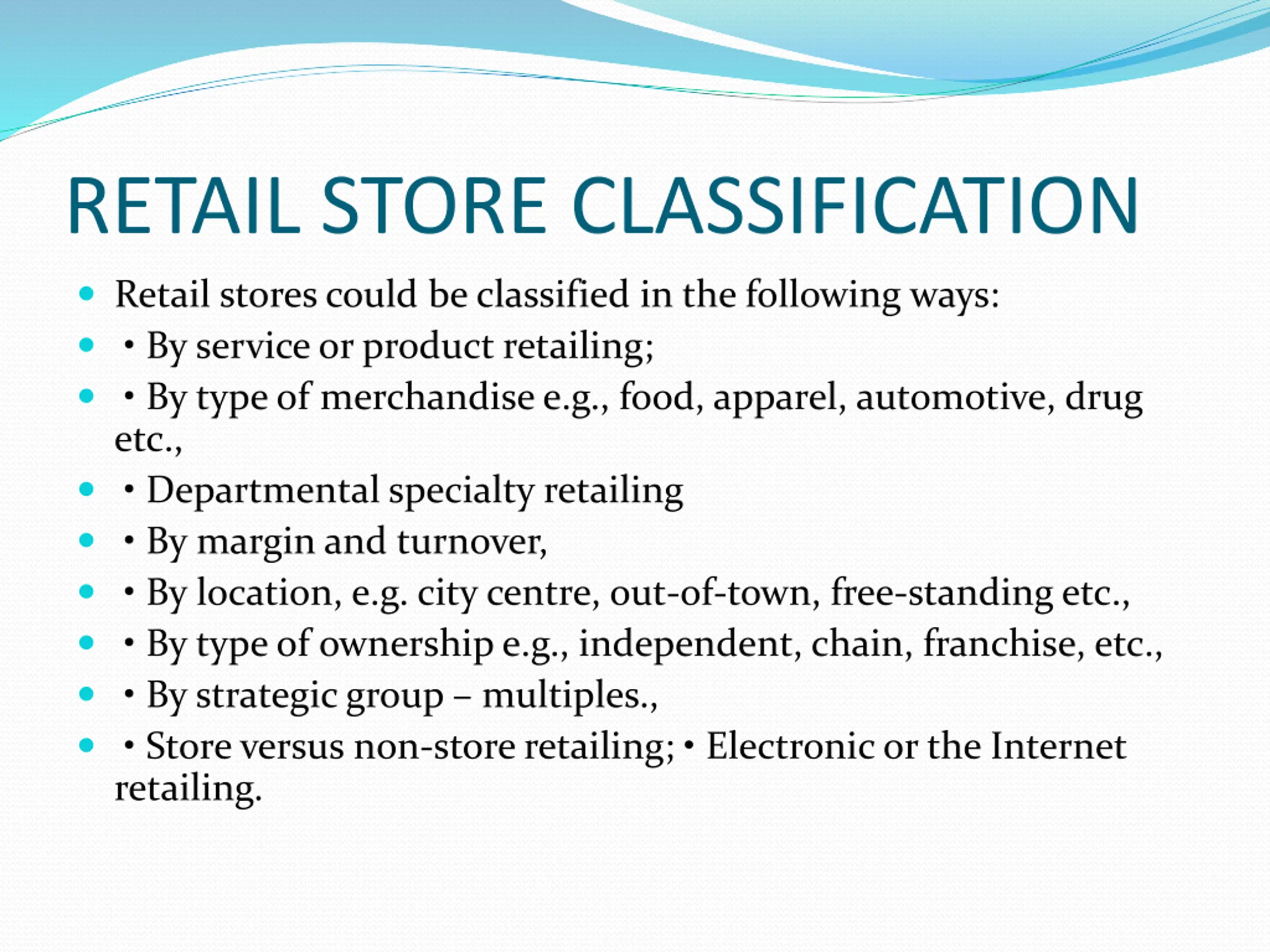 RETAIL STORE CLASSIFICATION Retail stores could be classified in the following ways: By service or product retailing; By type of merchandise e.g., food, apparel, automotive, drug etc., Departmental specialty retailing By margin and turnover, By location, e.g. city centre, out-of-town, free-standing etc., By type of ownership e.g., independent, chain, franchise, etc., By strategic group multiples., Store versus non-store retailing; Electronic or the Internet retailing.