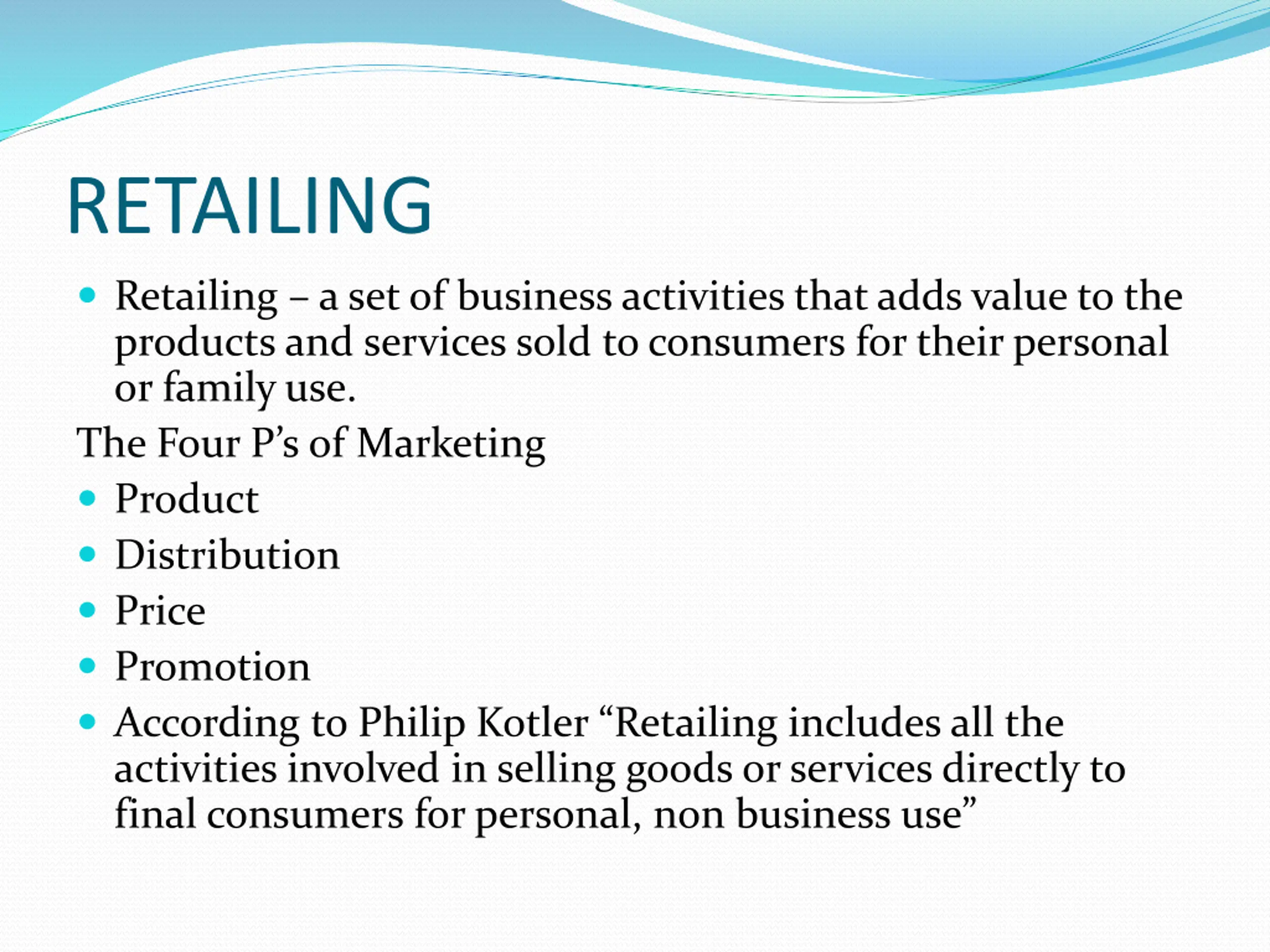 RETAILING Retailing a set of business activities that adds value to the products and services sold to consumers for their personal or family use. The Four P s of Marketing Product Distribution Price Promotion According to Philip Kotler Retailing includes all the activities involved in selling goods or services directly to final consumers for personal, non business use