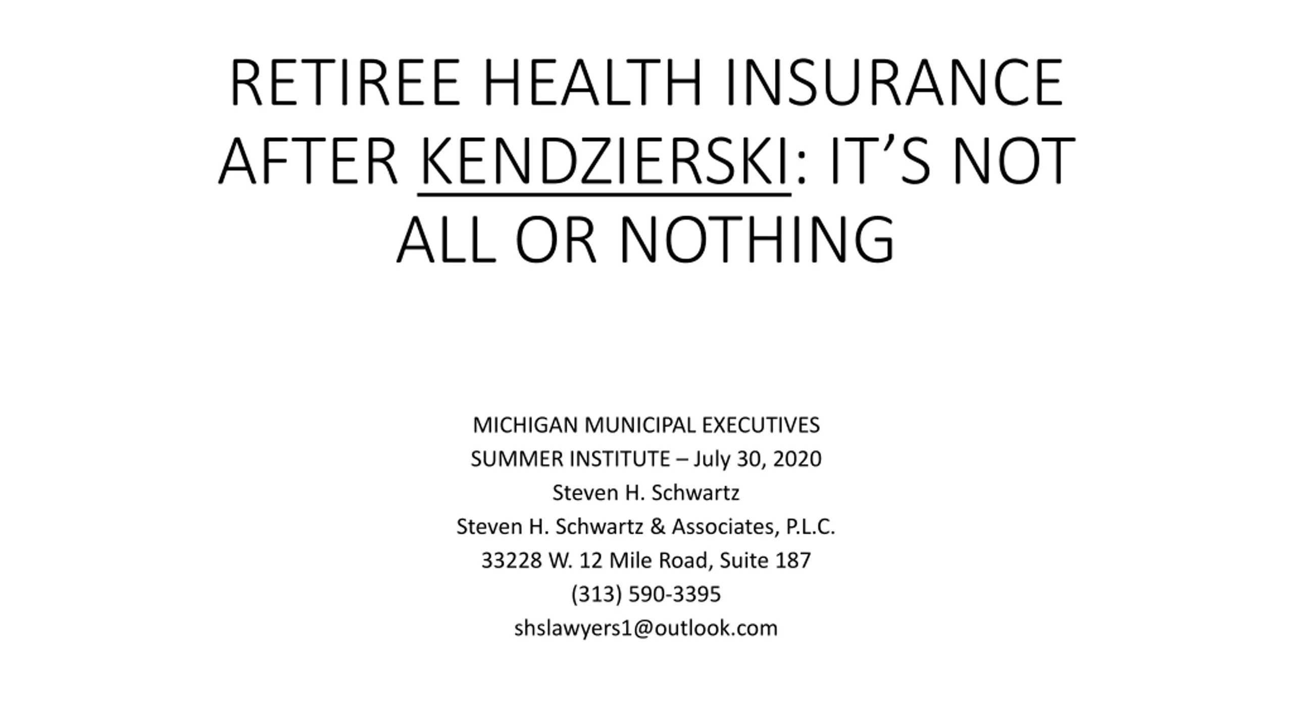 RETIREE HEALTH INSURANCE AFTER KENDZIERSKI: IT S NOT ALL OR NOTHING MICHIGAN MUNICIPAL EXECUTIVES SUMMER INSTITUTE July 30, 2020 Steven H. Schwartz Steven H. Schwartz & Associates, P.L.C. 33228 W. 12 Mile Road, Suite 187 (313) 590-3395 shslawyers1@outlook.com