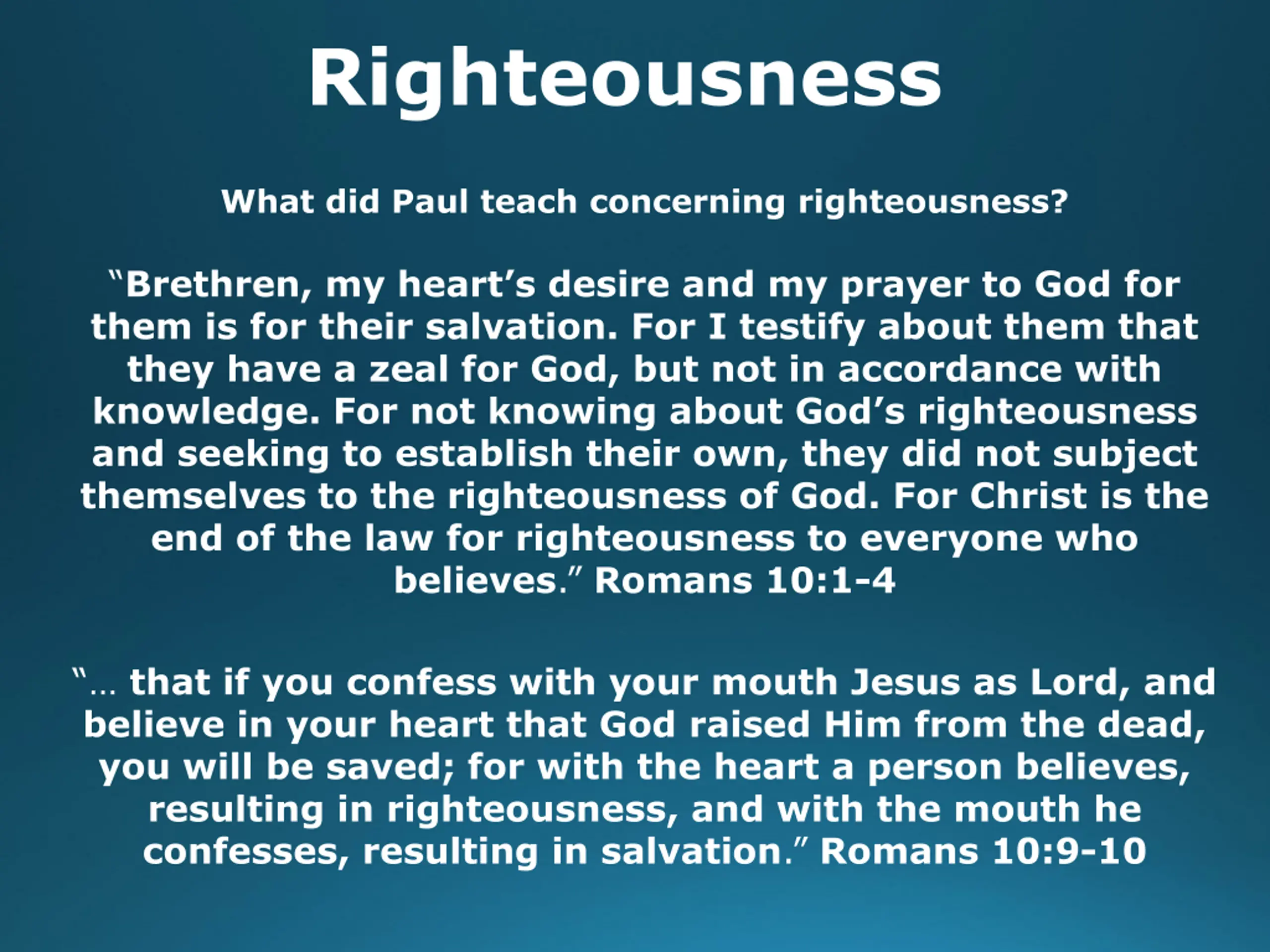 Righteousness What did Paul teach concerning righteousness? Brethren, my heart s desire and my prayer to God for them is for their salvation. For I testify about them that they have a zeal for God, but not in accordance with knowledge. For not knowing about God s righteousness and seeking to establish their own, they did not subject themselves to the righteousness of God. For Christ is the end of the law for righteousness to everyone who believes. Romans 10:1-4 that if you confess with your mouth Jesus as Lord, and believe in your heart that God raised Him from the dead, you will be saved; for with the heart a person believes, resulting in righteousness, and with the mouth he confesses, resulting in salvation. Romans 10:9-10