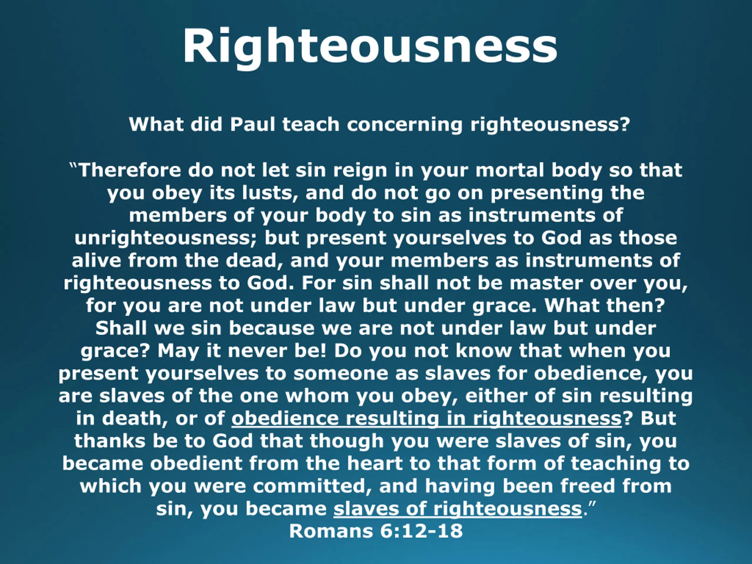 Righteousness What did Paul teach concerning righteousness? Therefore do not let sin reign in your mortal body so that you obey its lusts, and do not go on presenting the members of your body to sin as instruments of unrighteousness; but present yourselves to God as those alive from the dead, and your members as instruments of righteousness to God. For sin shall not be master over you, for you are not under law but under grace. What then? Shall we sin because we are not under law but under grace? May it never be! Do you not know that when you present yourselves to someone as slaves for obedience, you are slaves of the one whom you obey, either of sin resulting in death, or of obedience resulting in righteousness? But thanks be to God that though you were slaves of sin, you became obedient from the heart to that form of teaching to which you were committed, and having been freed from sin, you became slaves of righteousness. Romans 6:12-18