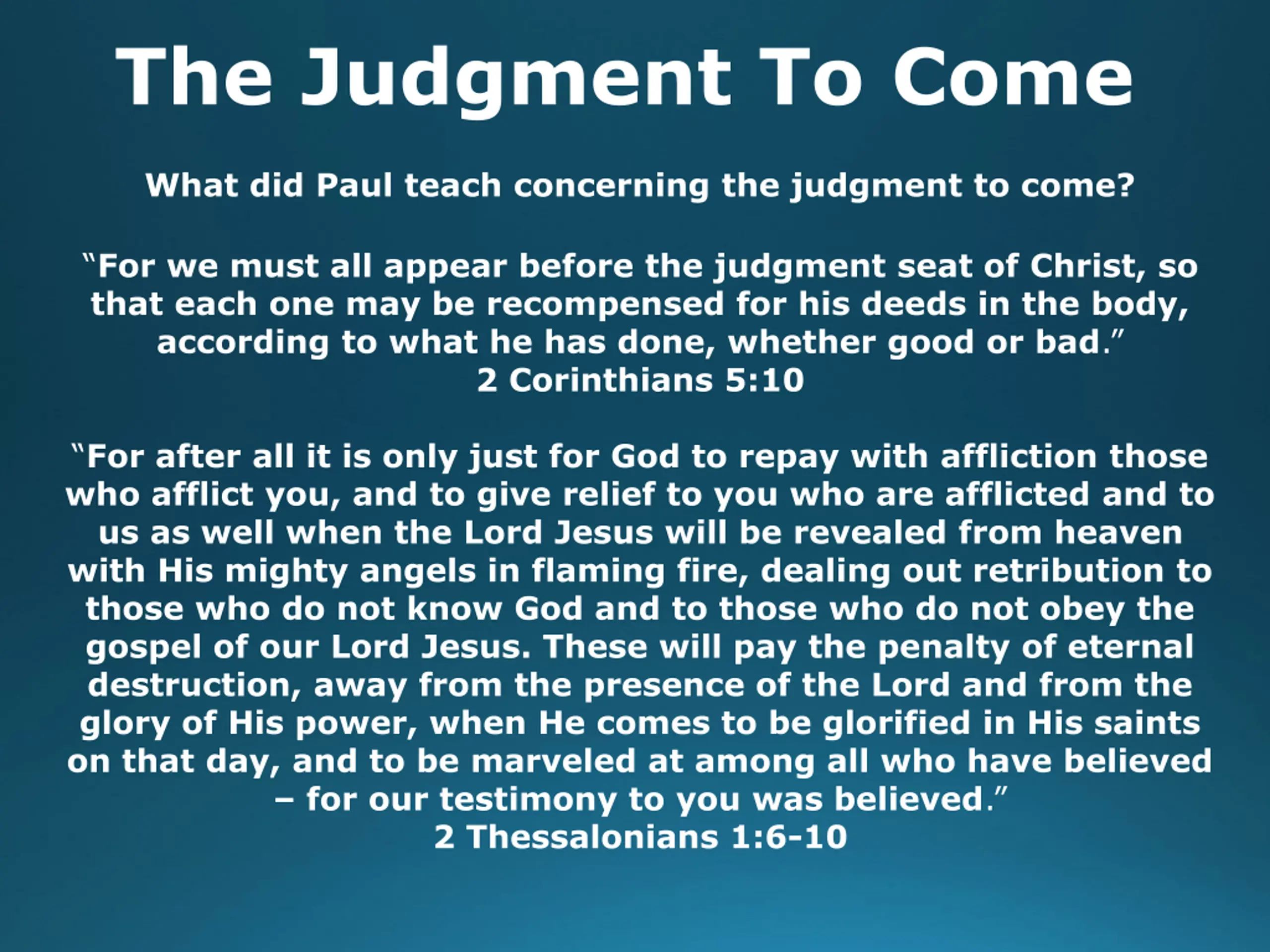 The Judgment To Come What did Paul teach concerning the judgment to come? For we must all appear before the judgment seat of Christ, so that each one may be recompensed for his deeds in the body, according to what he has done, whether good or bad. 2 Corinthians 5:10 For after all it is only just for God to repay with affliction those who afflict you, and to give relief to you who are afflicted and to us as well when the Lord Jesus will be revealed from heaven with His mighty angels in flaming fire, dealing out retribution to those who do not know God and to those who do not obey the gospel of our Lord Jesus. These will pay the penalty of eternal destruction, away from the presence of the Lord and from the glory of His power, when He comes to be glorified in His saints on that day, and to be marveled at among all who have believed for our testimony to you was believed. 2 Thessalonians 1:6-10