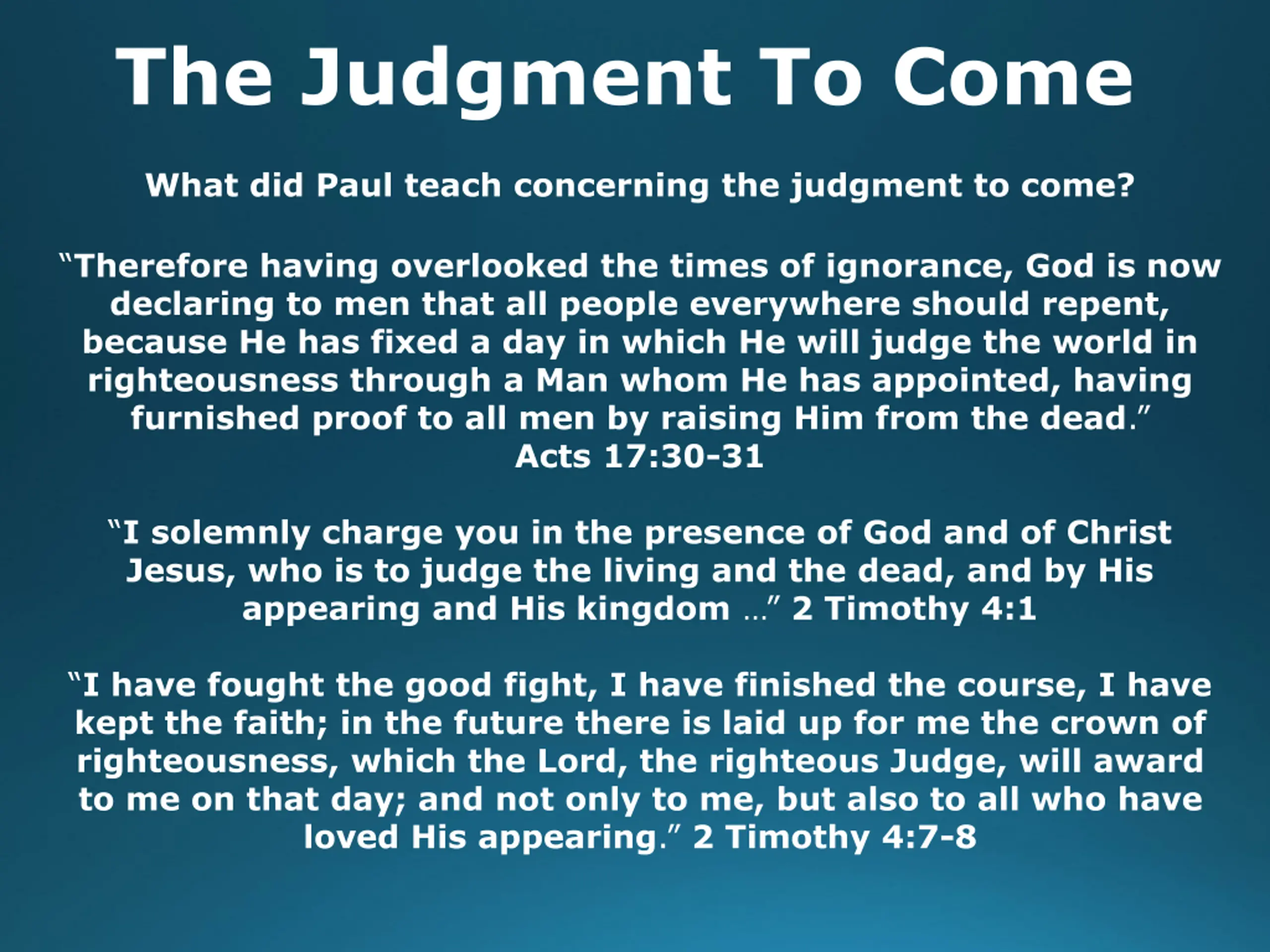 The Judgment To Come What did Paul teach concerning the judgment to come? Therefore having overlooked the times of ignorance, God is now declaring to men that all people everywhere should repent, because He has fixed a day in which He will judge the world in righteousness through a Man whom He has appointed, having furnished proof to all men by raising Him from the dead. Acts 17:30-31 I solemnly charge you in the presence of God and of Christ Jesus, who is to judge the living and the dead, and by His appearing and His kingdom 2 Timothy 4:1 I have fought the good fight, I have finished the course, I have kept the faith; in the future there is laid up for me the crown of righteousness, which the Lord, the righteous Judge, will award to me on that day; and not only to me, but also to all who have loved His appearing. 2 Timothy 4:7-8