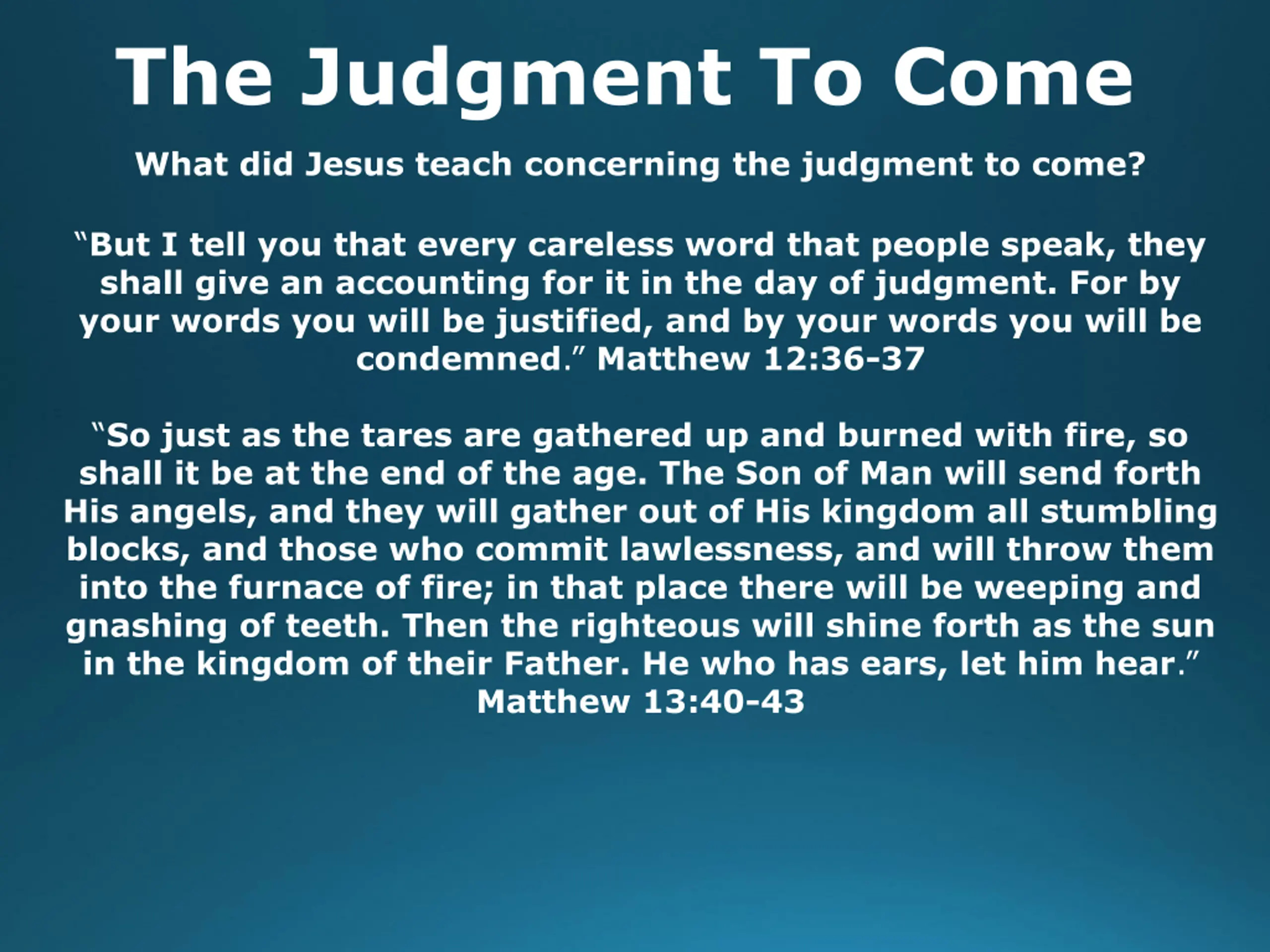 The Judgment To Come What did Jesus teach concerning the judgment to come? But I tell you that every careless word that people speak, they shall give an accounting for it in the day of judgment. For by your words you will be justified, and by your words you will be condemned. Matthew 12:36-37 So just as the tares are gathered up and burned with fire, so shall it be at the end of the age. The Son of Man will send forth His angels, and they will gather out of His kingdom all stumbling blocks, and those who commit lawlessness, and will throw them into the furnace of fire; in that place there will be weeping and gnashing of teeth. Then the righteous will shine forth as the sun in the kingdom of their Father. He who has ears, let him hear. Matthew 13:40-43