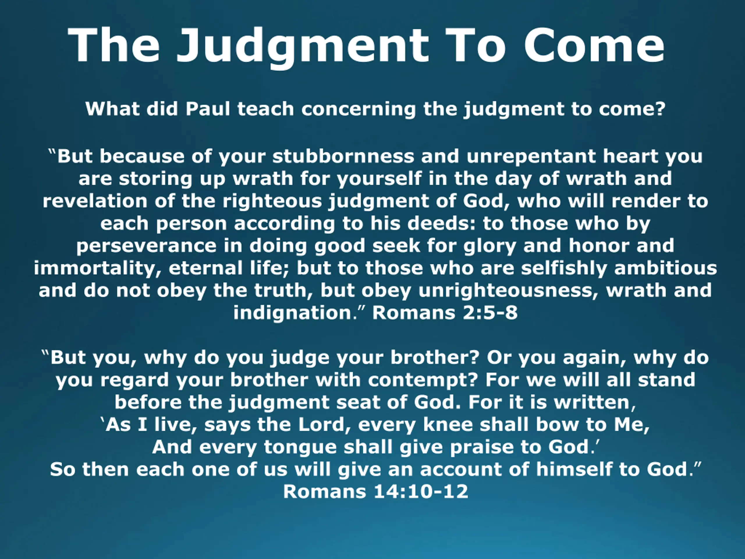 The Judgment To Come What did Paul teach concerning the judgment to come? But because of your stubbornness and unrepentant heart you are storing up wrath for yourself in the day of wrath and revelation of the righteous judgment of God, who will render to each person according to his deeds: to those who by perseverance in doing good seek for glory and honor and immortality, eternal life; but to those who are selfishly ambitious and do not obey the truth, but obey unrighteousness, wrath and indignation. Romans 2:5-8 But you, why do you judge your brother? Or you again, why do you regard your brother with contempt? For we will all stand before the judgment seat of God. For it is written, As I live, says the Lord, every knee shall bow to Me, And every tongue shall give praise to God. So then each one of us will give an account of himself to God. Romans 14:10-12