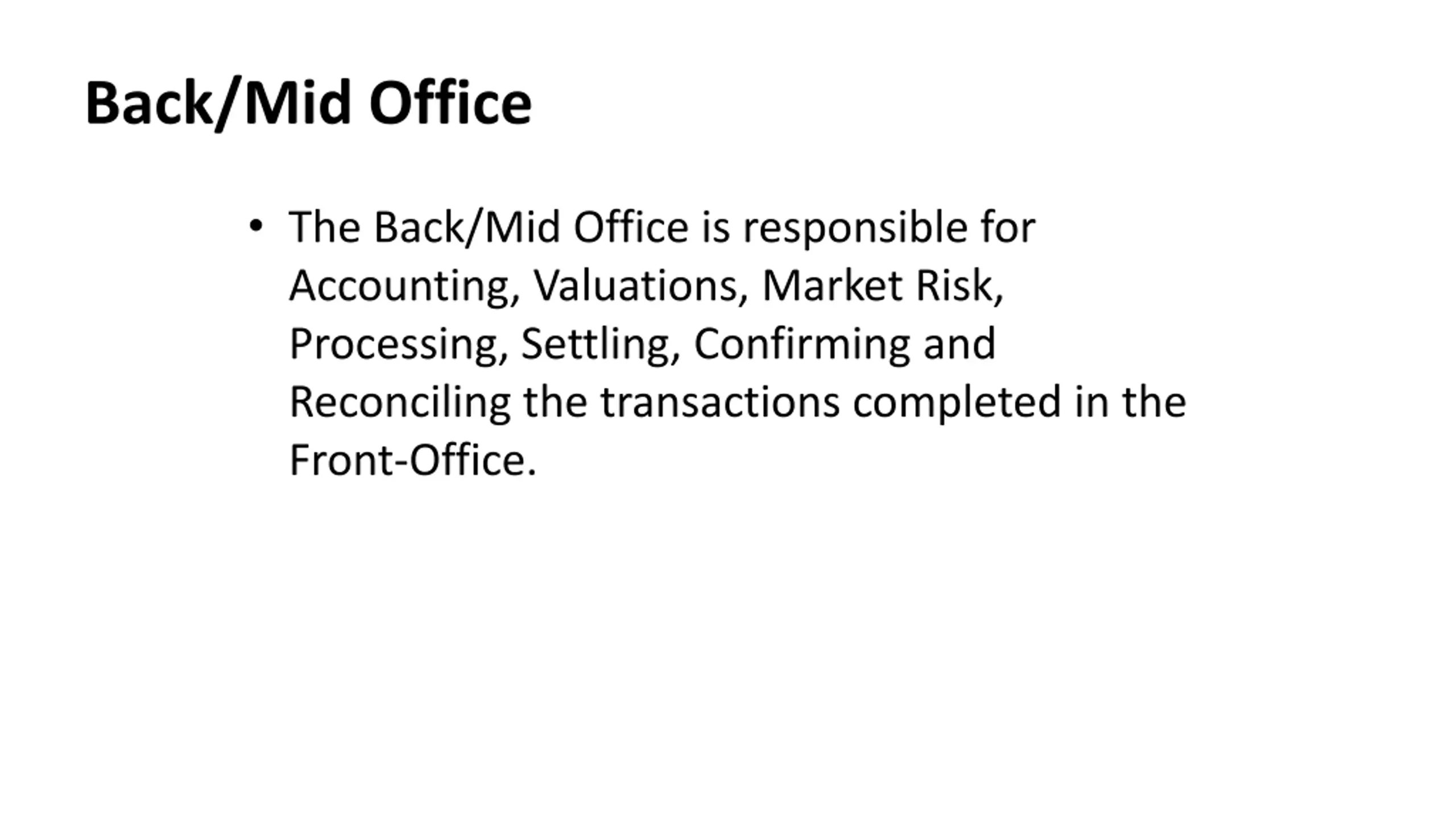 Back/Mid Office The Back/Mid Office is responsible for Accounting, Valuations, Market Risk, Processing, Settling, Confirming and Reconciling the transactions completed in the Front-Office.