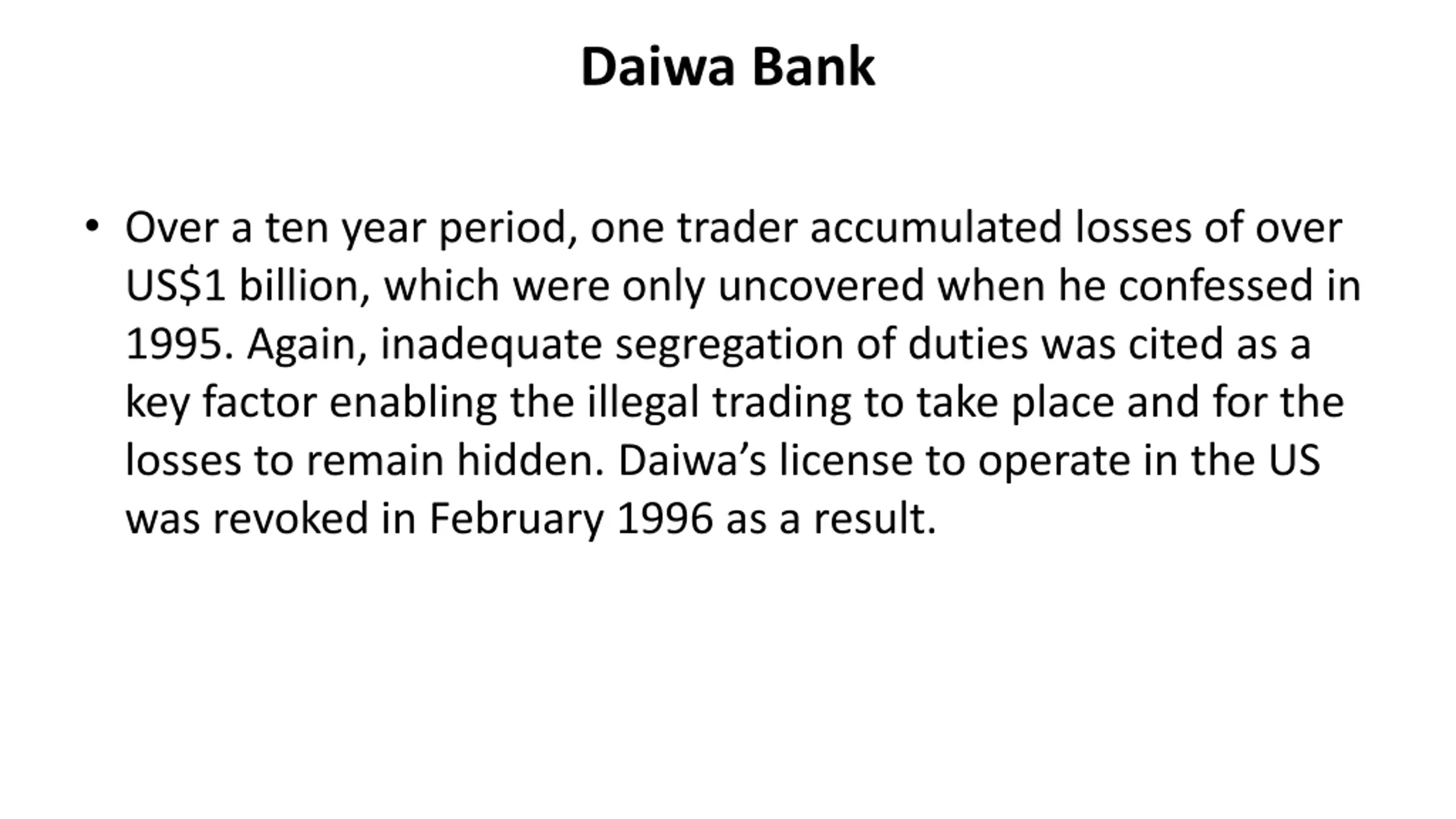 Daiwa Bank Over a ten year period, one trader accumulated losses of over US$1 billion, which were only uncovered when he confessed in 1995. Again, inadequate segregation of duties was cited as a key factor enabling the illegal trading to take place and for the losses to remain hidden. Daiwa s license to operate in the US was revoked in February 1996 as a result.