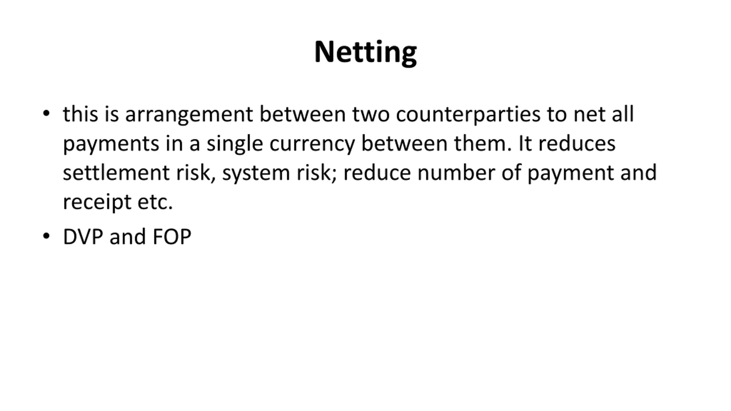 Netting this is arrangement between two counterparties to net all payments in a single currency between them. It reduces settlement risk, system risk; reduce number of payment and receipt etc. DVP and FOP