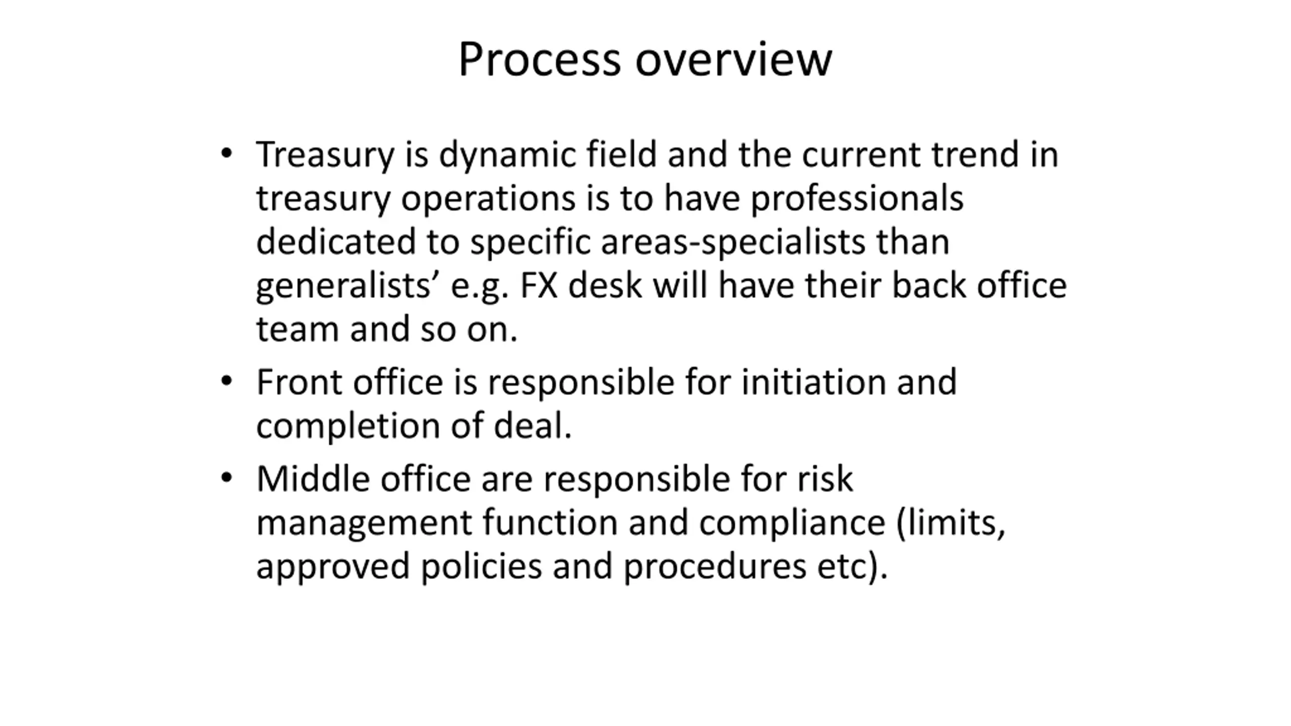 Process overview Treasury is dynamic field and the current trend in treasury operations is to have professionals dedicated to specific areas-specialists than generalists e.g. FX desk will have their back office team and so on. Front office is responsible for initiation and completion of deal. Middle office are responsible for risk management function and compliance (limits, approved policies and procedures etc).