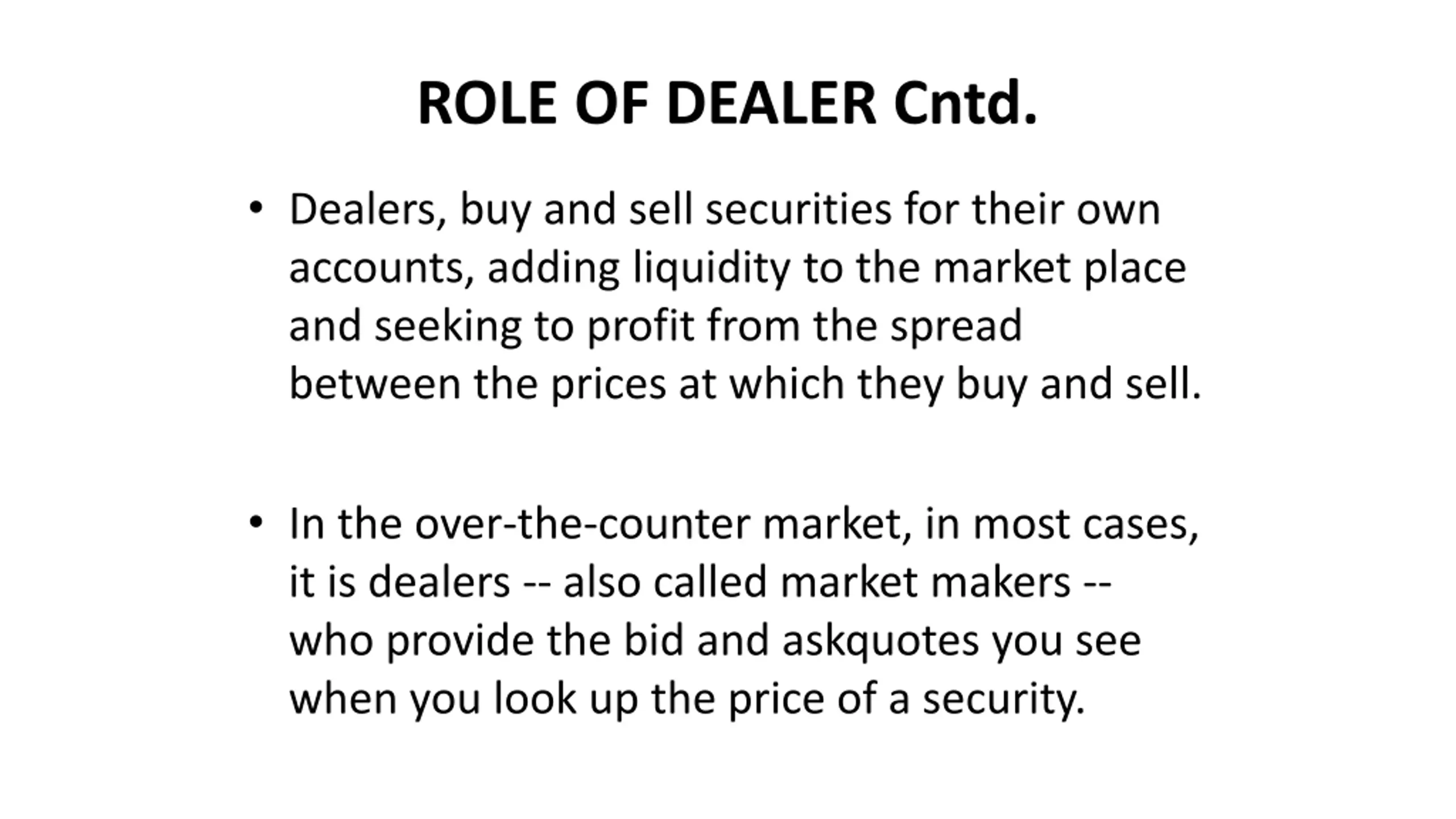ROLE OF DEALER Cntd. Dealers, buy and sell securities for their own accounts, adding liquidity to the market place and seeking to profit from the spread between the prices at which they buy and sell. In the over-the-counter market, in most cases, it is dealers -- also called market makers -- who provide the bid and askquotes you see when you look up the price of a security.