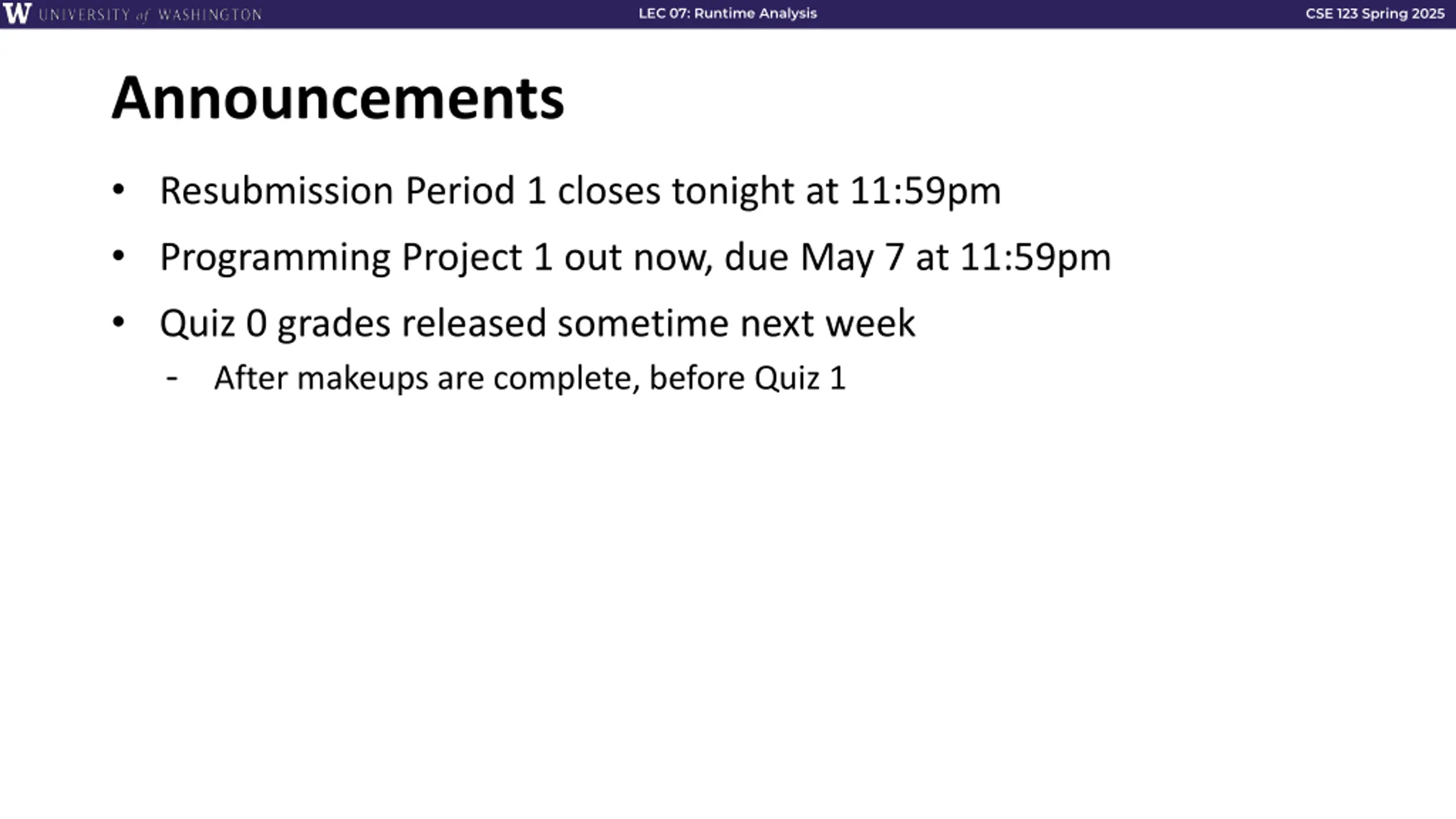 LEC 07: Runtime Analysis CSE 123 Spring 2025 Announcements Resubmission Period 1 closes tonight at 11:59pm Programming Project 1 out now, due May 7 at 11:59pm Quiz 0 grades released sometime next week - After makeups are complete, before Quiz 1