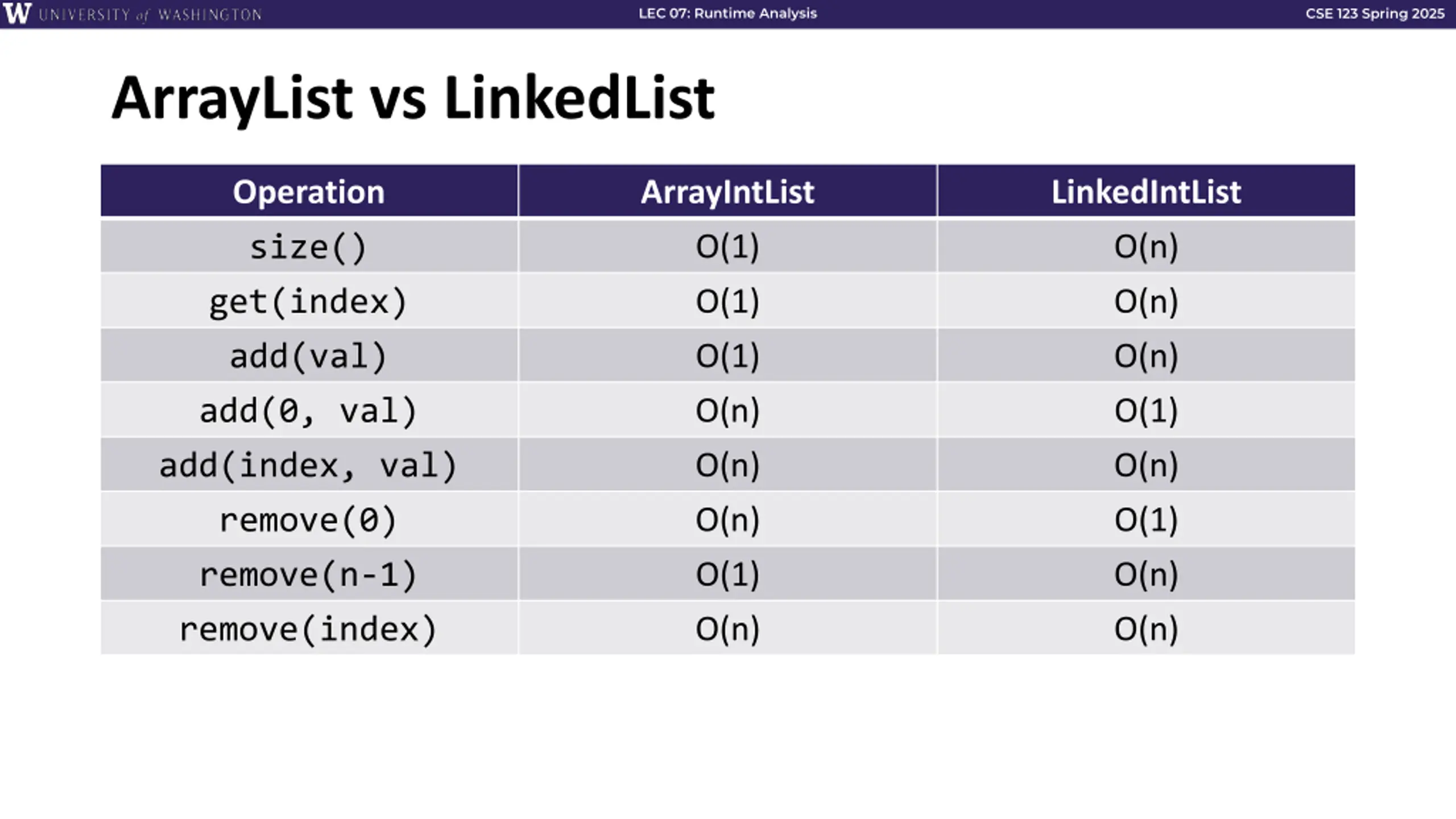 LEC 07: Runtime Analysis CSE 123 Spring 2025 ArrayList vs LinkedList Operation ArrayIntList O(1) LinkedIntList O(n) size() O(1) O(n) get(index) O(1) O(n) add(val) O(n) O(1) add(0, val) O(n) O(n) add(index, val) O(n) O(1) remove(0) O(1) O(n) O(n) O(n) remove(n-1) remove(index)