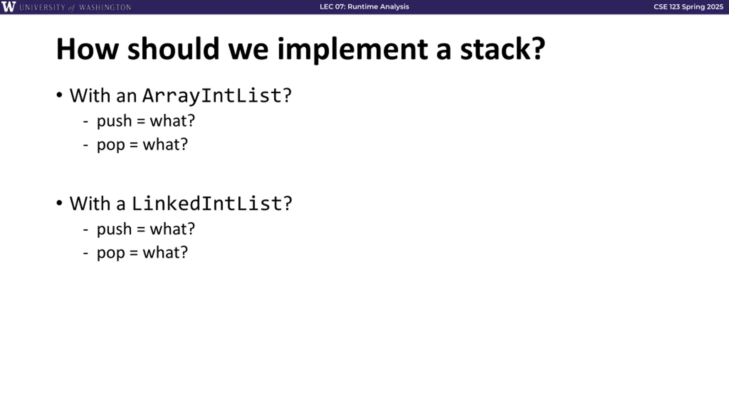LEC 07: Runtime Analysis CSE 123 Spring 2025 How should we implement a stack? With an ArrayIntList? - push = what? - pop = what? With a LinkedIntList? - push = what? - pop = what?
