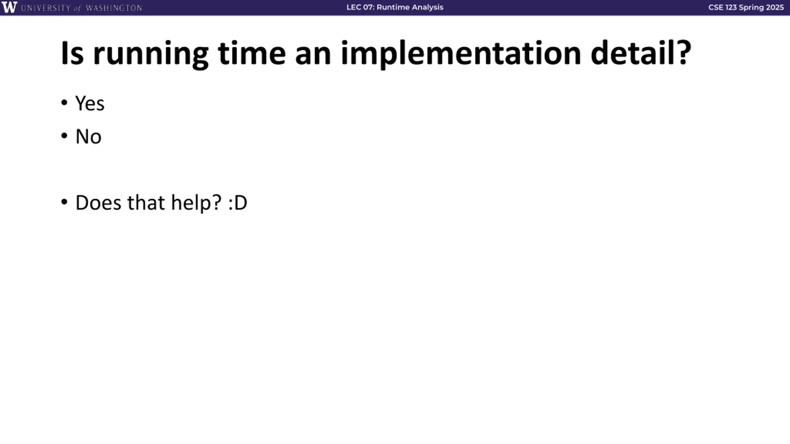 LEC 07: Runtime Analysis CSE 123 Spring 2025 Is running time an implementation detail? Yes No Does that help? :D