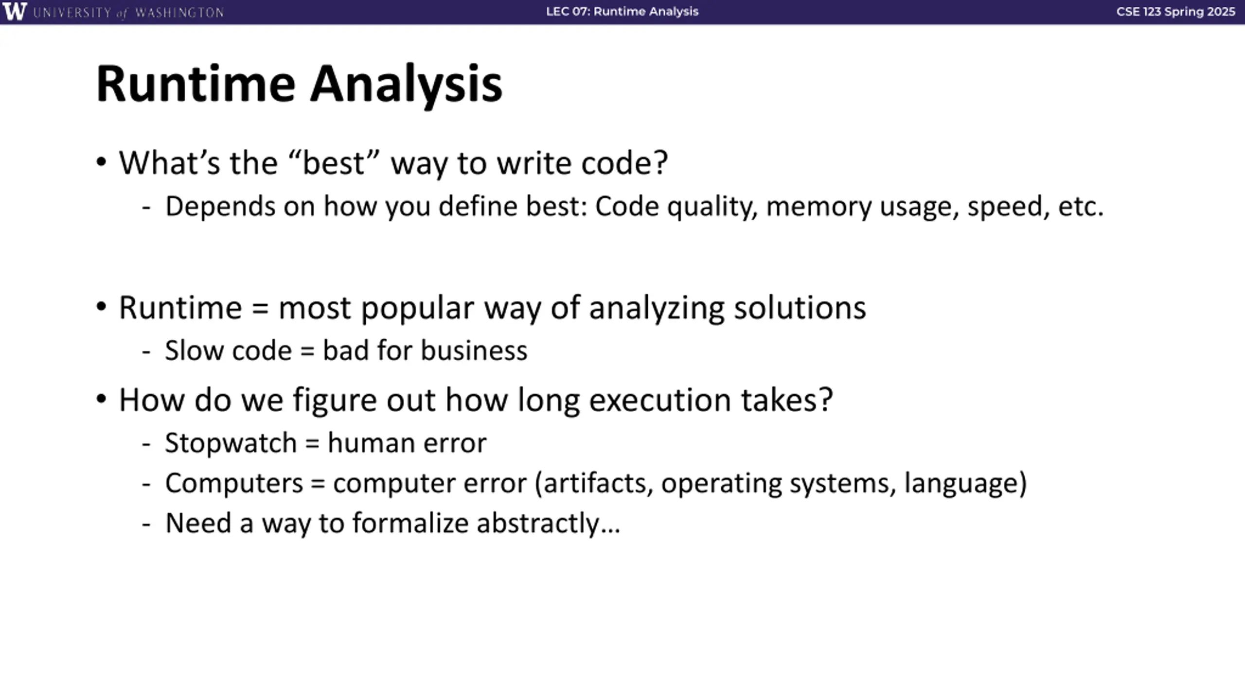 LEC 07: Runtime Analysis CSE 123 Spring 2025 Runtime Analysis What s the best way to write code? - Depends on how you define best: Code quality, memory usage, speed, etc. Runtime = most popular way of analyzing solutions - Slow code = bad for business How do we figure out how long execution takes? - Stopwatch = human error - Computers = computer error (artifacts, operating systems, language) - Need a way to formalize abstractly