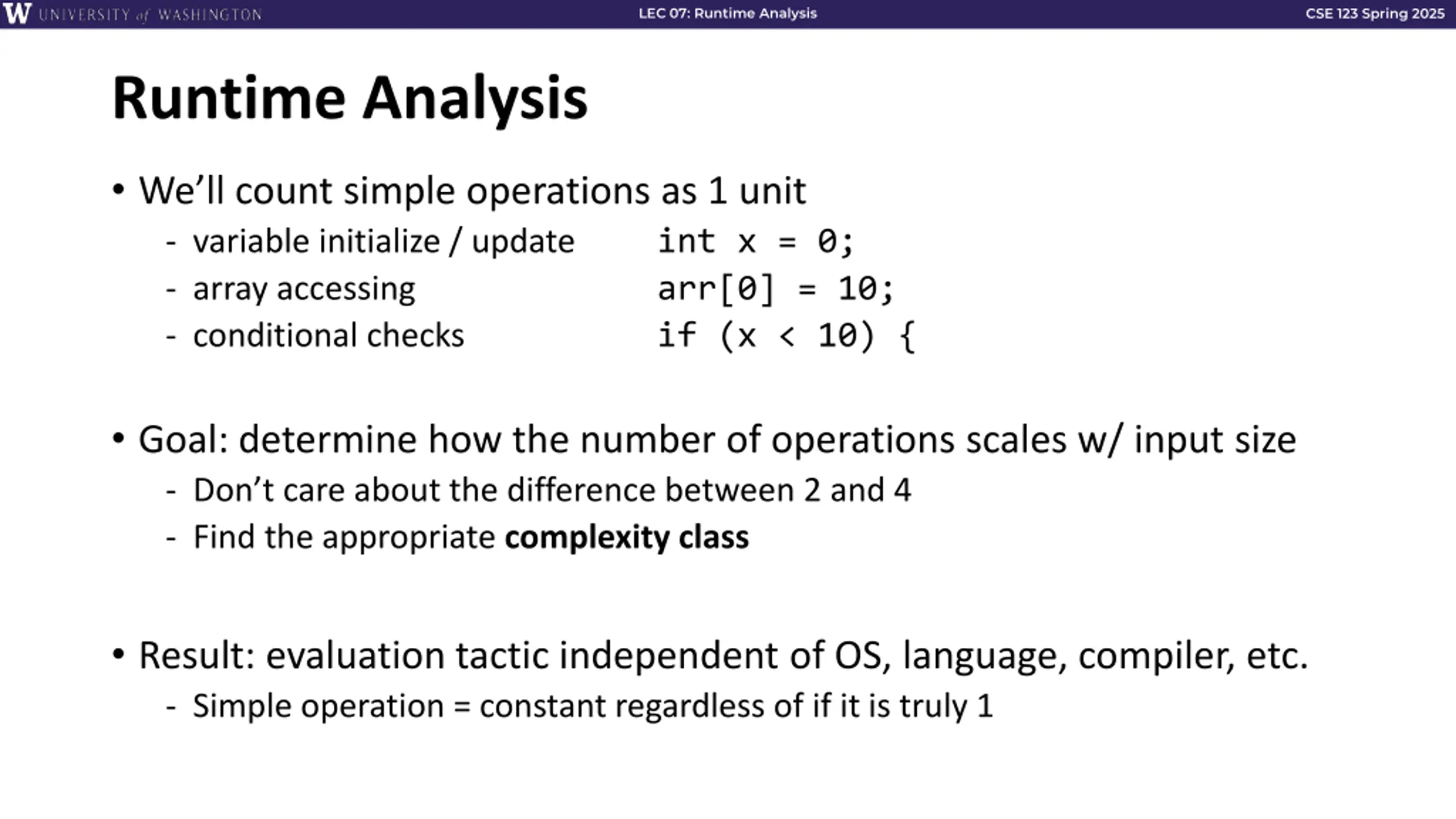 LEC 07: Runtime Analysis CSE 123 Spring 2025 Runtime Analysis We ll count simple operations as 1 unit - variable initialize / update - array accessing - conditional checks int x = 0; arr[0] = 10; if (x < 10) { Goal: determine how the number of operations scales w/ input size - Don t care about the difference between 2 and 4 - Find the appropriate complexity class Result: evaluation tactic independent of OS, language, compiler, etc. - Simple operation = constant regardless of if it is truly 1