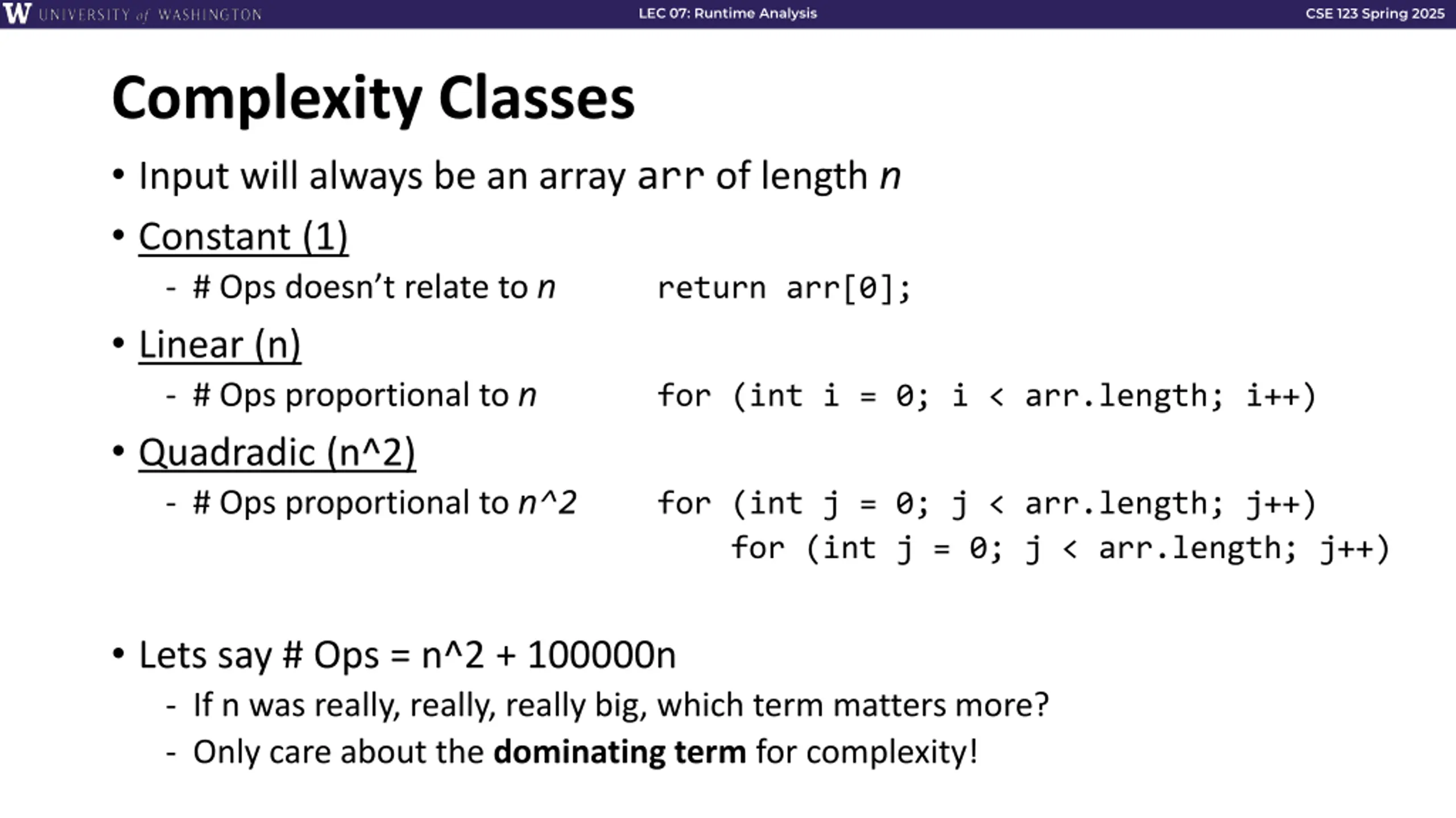 LEC 07: Runtime Analysis CSE 123 Spring 2025 Complexity Classes Input will always be an array arr of length n Constant (1) - # Ops doesn t relate to n Linear (n) - # Ops proportional to n Quadradic (n^2) - # Ops proportional to n^2 return arr[0]; for (int i = 0; i < arr.length; i++) for (int j = 0; j < arr.length; j++) for (int j = 0; j < arr.length; j++) Lets say # Ops = n^2 + 100000n - If n was really, really, really big, which term matters more? - Only care about the dominating term for complexity!