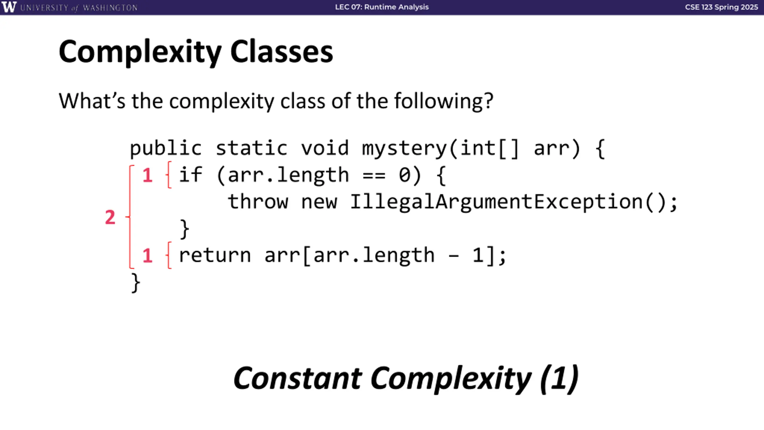 LEC 07: Runtime Analysis CSE 123 Spring 2025 Complexity Classes What s the complexity class of the following? public static void mystery(int[] arr) { if (arr.length == 0) { throw new IllegalArgumentException(); } return arr[arr.length 1]; } 1 2 1 Constant Complexity (1)