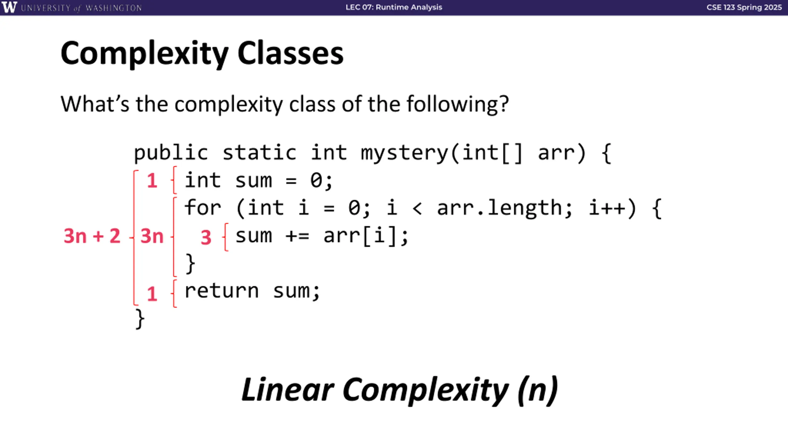 LEC 07: Runtime Analysis CSE 123 Spring 2025 Complexity Classes What s the complexity class of the following? public static int mystery(int[] arr) { int sum = 0; for (int i = 0; i < arr.length; i++) { sum += arr[i]; } return sum; } 1 3n + 2 3n 3 1 Linear Complexity (n)