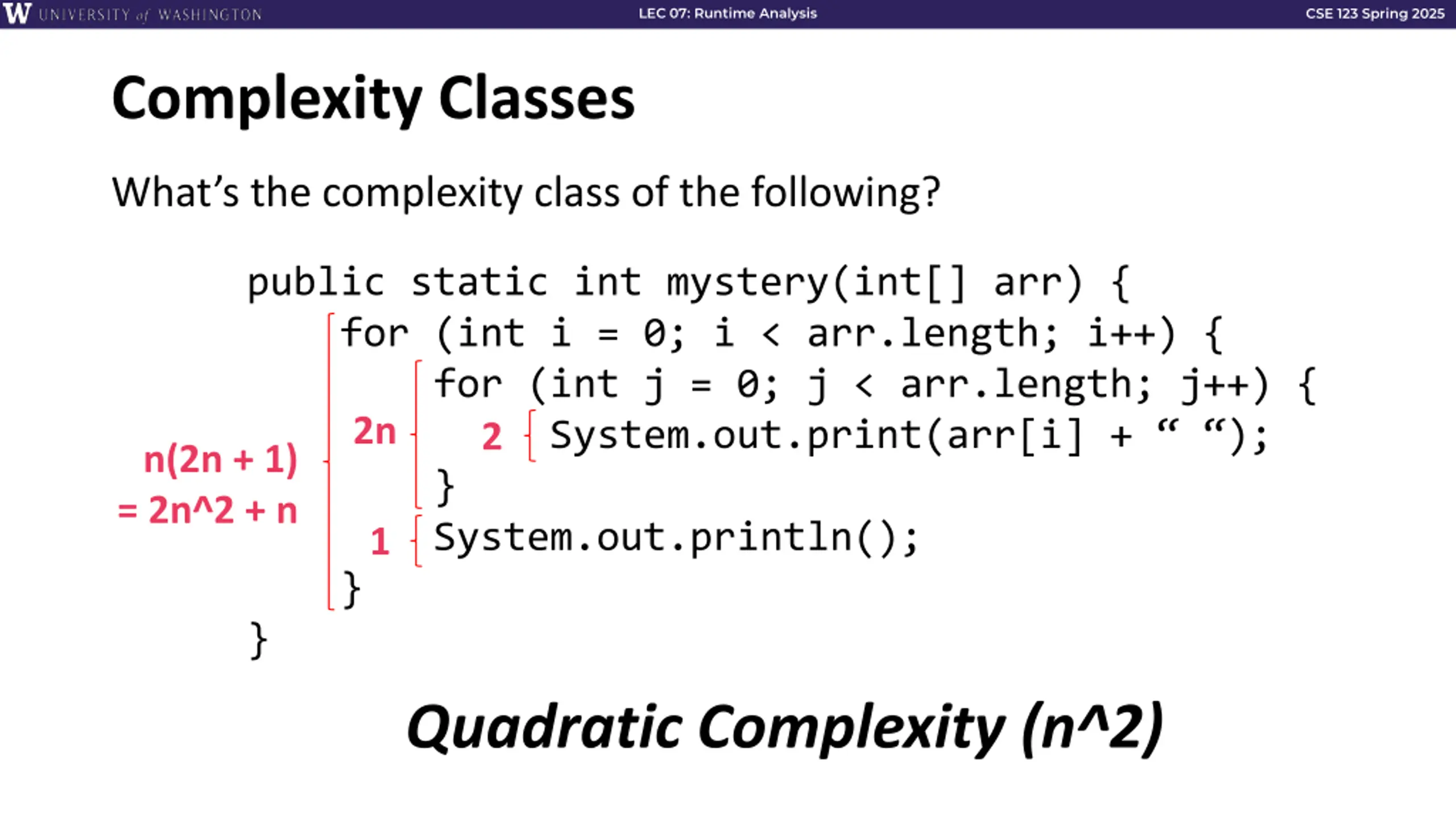 LEC 07: Runtime Analysis CSE 123 Spring 2025 Complexity Classes What s the complexity class of the following? public static int mystery(int[] arr) { for (int i = 0; i < arr.length; i++) { for (int j = 0; j < arr.length; j++) { System.out.print(arr[i] + ); } System.out.println(); } } 2n 2 n(2n + 1) = 2n^2 + n 1 Quadratic Complexity (n^2)