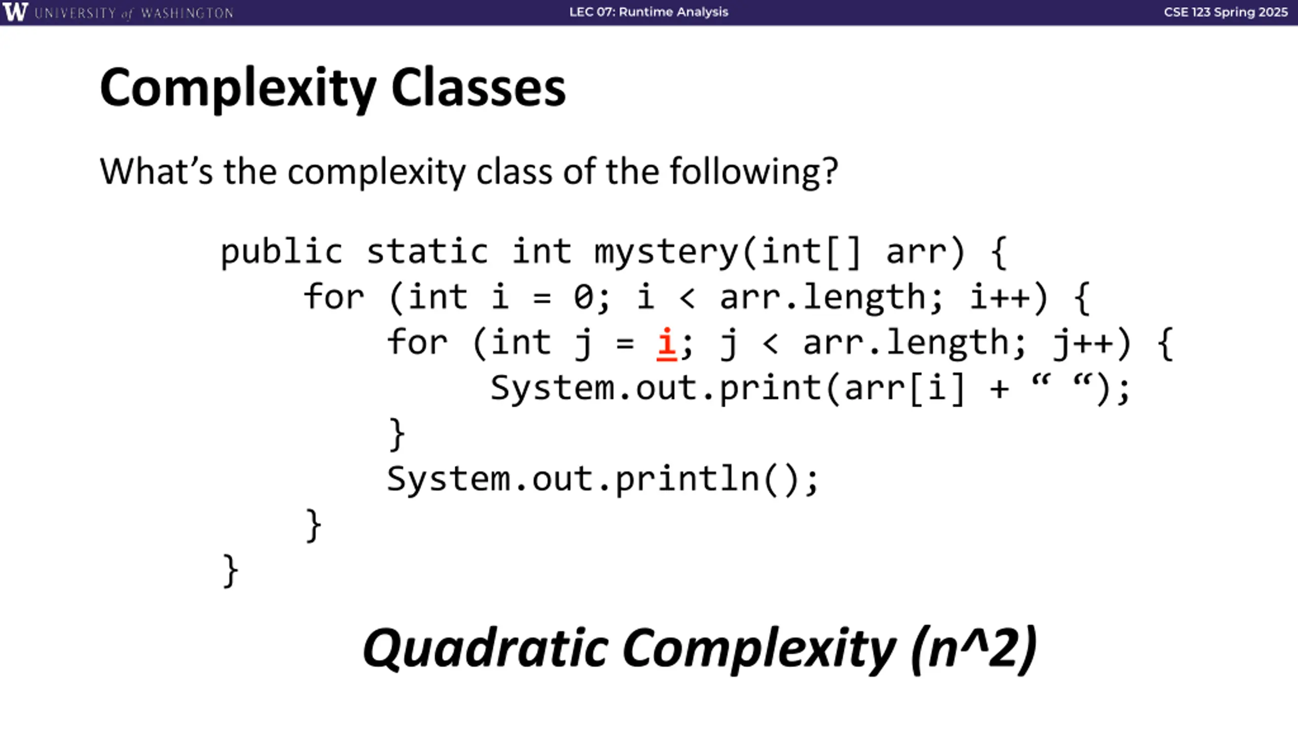 LEC 07: Runtime Analysis CSE 123 Spring 2025 Complexity Classes What s the complexity class of the following? public static int mystery(int[] arr) { for (int i = 0; i < arr.length; i++) { for (int j = i; j < arr.length; j++) { System.out.print(arr[i] + ); } System.out.println(); } } Quadratic Complexity (n^2)