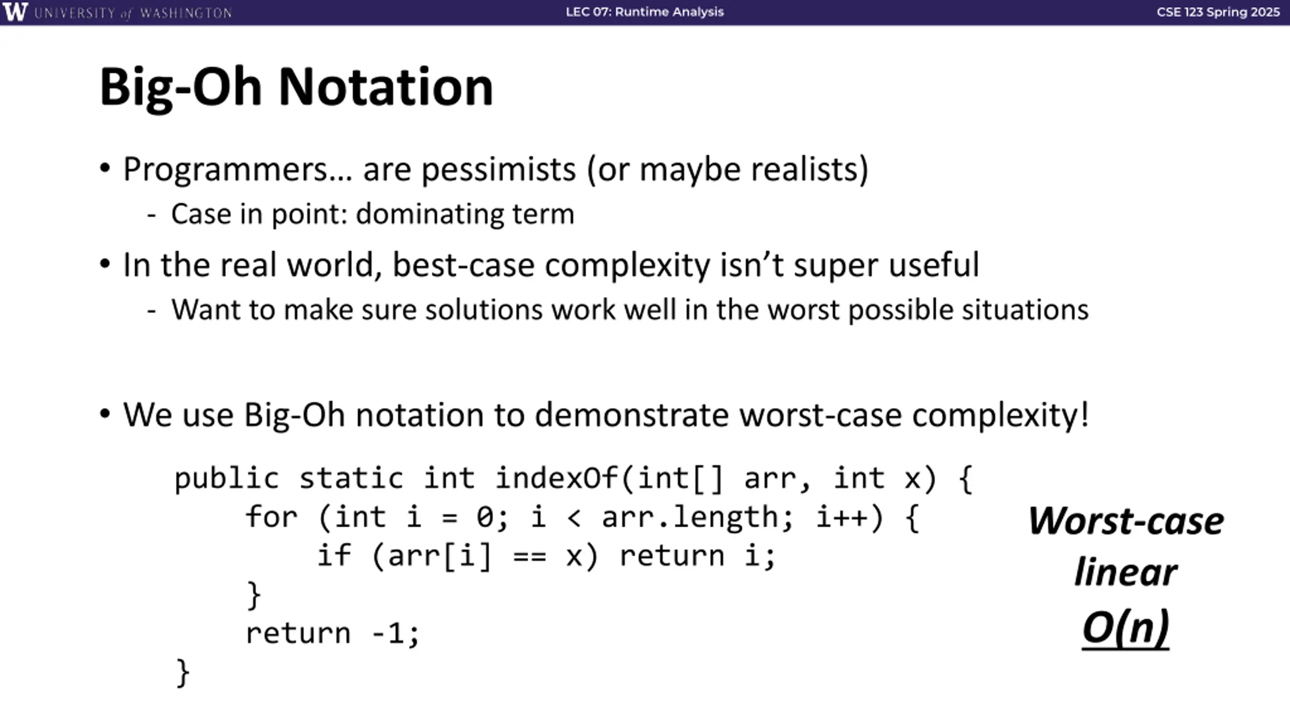 LEC 07: Runtime Analysis CSE 123 Spring 2025 Big-Oh Notation Programmers are pessimists (or maybe realists) - Case in point: dominating term In the real world, best-case complexity isn t super useful - Want to make sure solutions work well in the worst possible situations We use Big-Oh notation to demonstrate worst-case complexity! public static int indexOf(int[] arr, int x) { for (int i = 0; i < arr.length; i++) { if (arr[i] == x) return i; } return -1; } Worst-case linear O(n)