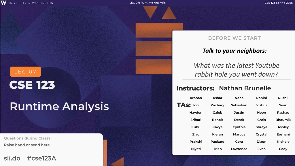 LEC 07: Runtime Analysis CSE 123 Spring 2025 BEFORE WE START Talk to your neighbors: What was the latest Youtube rabbit hole you went down? LEC 07 CSE 123 CSE 123 Instructors: Nathan Brunelle Arohan Ashar Neha Rohini Rushil Runtime Analysis TAs: Ido Zachary Sebastian Joshua Sean Hayden Caleb Justin Heon Rashad Srihari Benoit Derek Chris Bhaumik Kuhu Kavya Cynthia Shreya Ashley Ziao Kieran Marcus Crystal Eeshani Questions during Class? Prakshi Packard Cora Dixon Nichole Raise hand or send here Niyati Trien Lawrence Evan Cady sli.do #cse123A