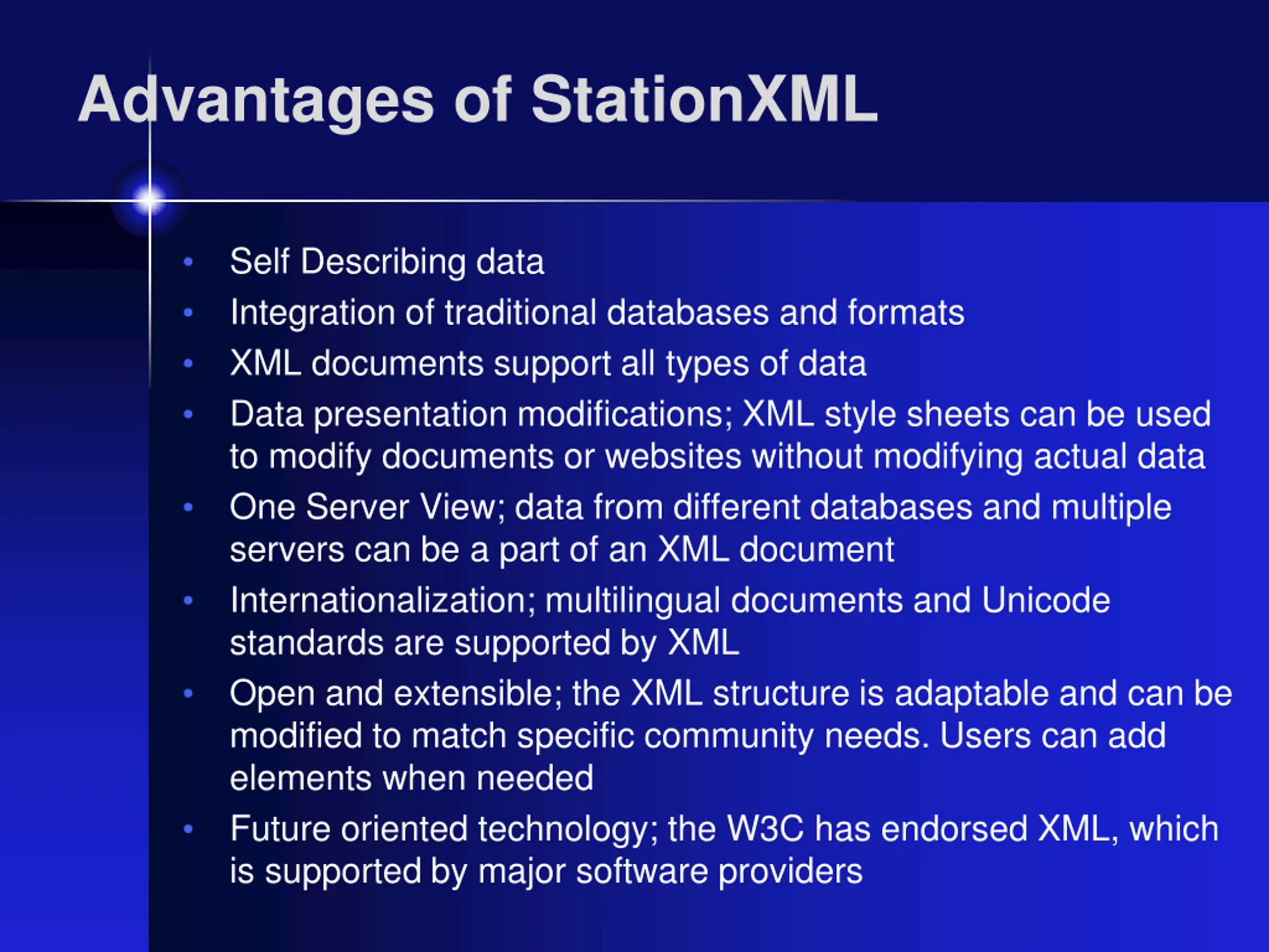 Advantages of StationXML Self Describing data Integration of traditional databases and formats XML documents support all types of data Data presentation modifications; XML style sheets can be used to modify documents or websites without modifying actual data One Server View; data from different databases and multiple servers can be a part of an XML document Internationalization; multilingual documents and Unicode standards are supported by XML Open and extensible; the XML structure is adaptable and can be modified to match specific community needs. Users can add elements when needed Future oriented technology; the W3C has endorsed XML, which is supported by major software providers