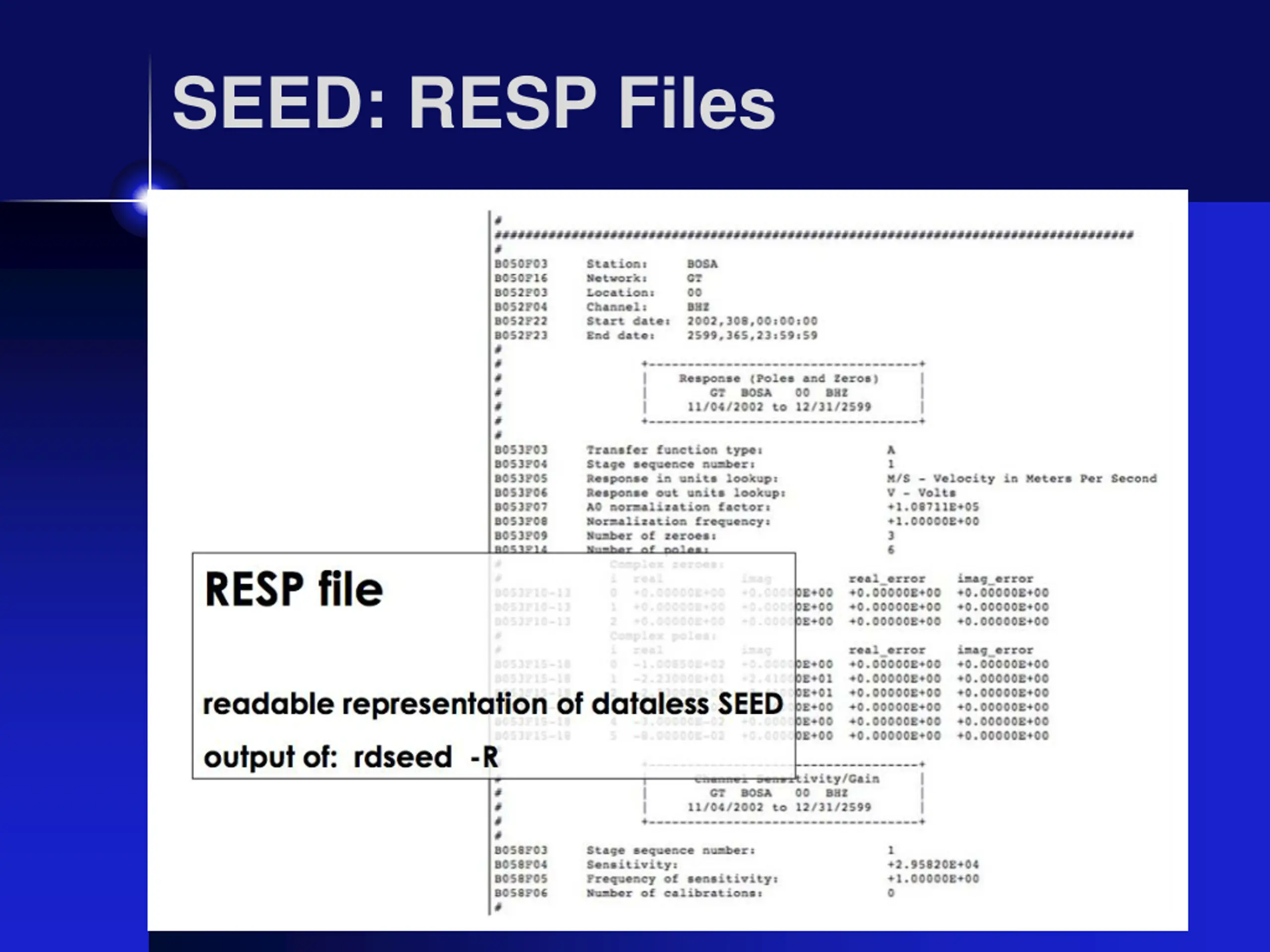 SEED History <1985 1985 working group on digital data exchange FDSN (International Federation of Digital Seismograph Networks) 1987 FDSN draft Standard developed by USGS 1988 FDSN Official Release (version 2.0) 1990 Version 2.1 (indexing, improved cross references) 1991 Version 2.2 (dataless SEED) 1992 version 2.3 (miniSEED, FDSN Network Codes) 2004 Version 2.4 (data quality type code) 2012 FDSN StationXML (SEED + more, in XML) IDA, GDSN . IASPEI Commission on Practice SEED is changing from a full SEED file (metadata & miniSEED) to decoupled metadata in StationXML format and time series in miniSEED