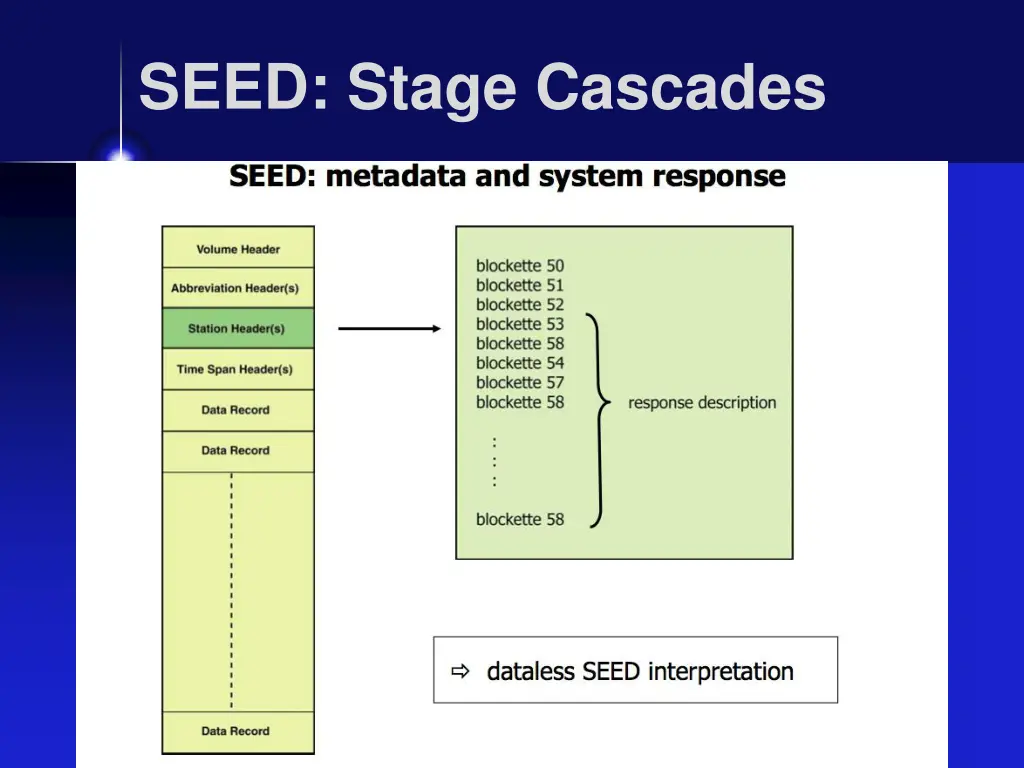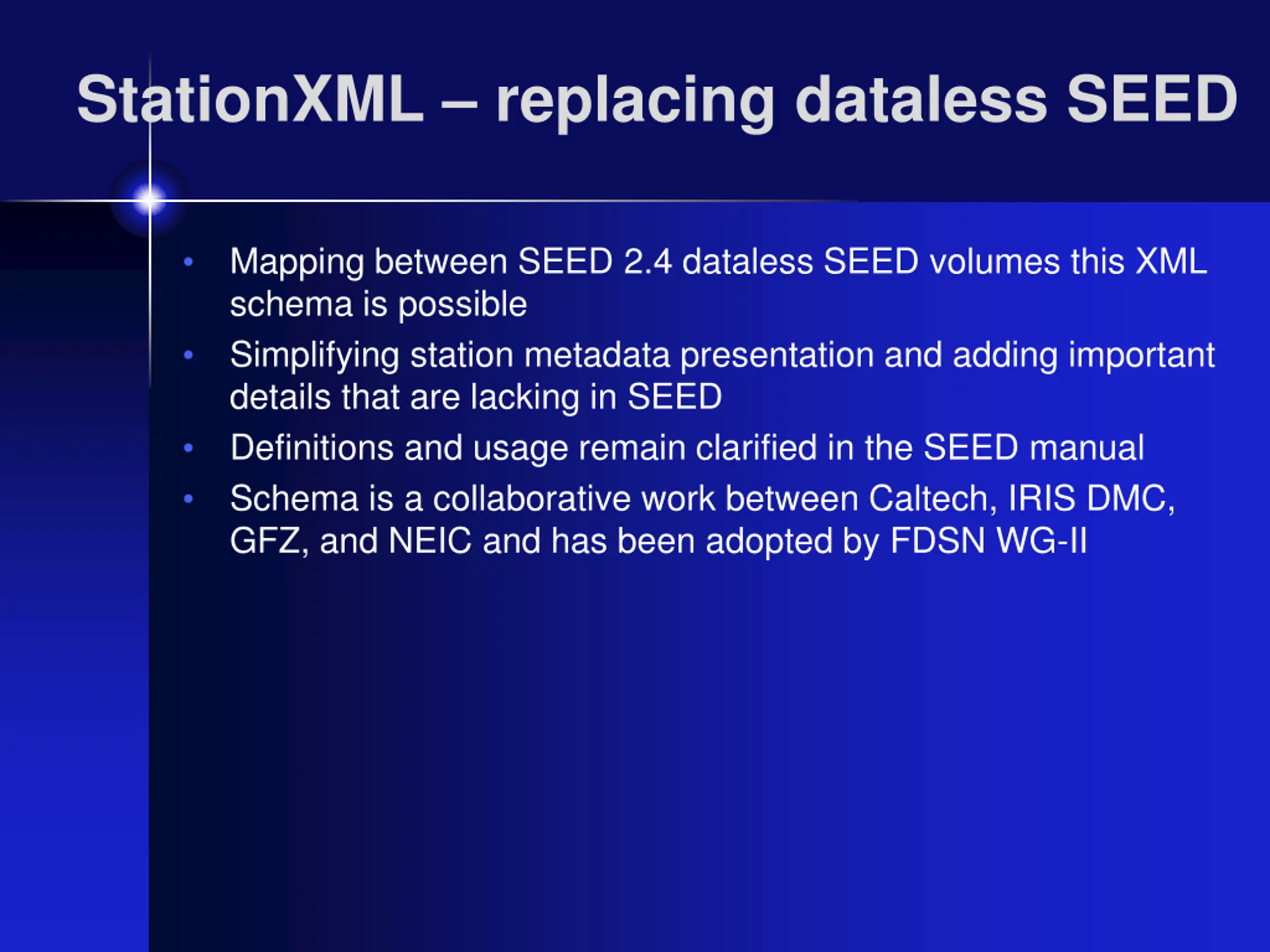 StationXML replacing dataless SEED Mapping between SEED 2.4 dataless SEED volumes this XML schema is possible Simplifying station metadata presentation and adding important details that are lacking in SEED Definitions and usage remain clarified in the SEED manual Schema is a collaborative work between Caltech, IRIS DMC, GFZ, and NEIC and has been adopted by FDSN WG-II