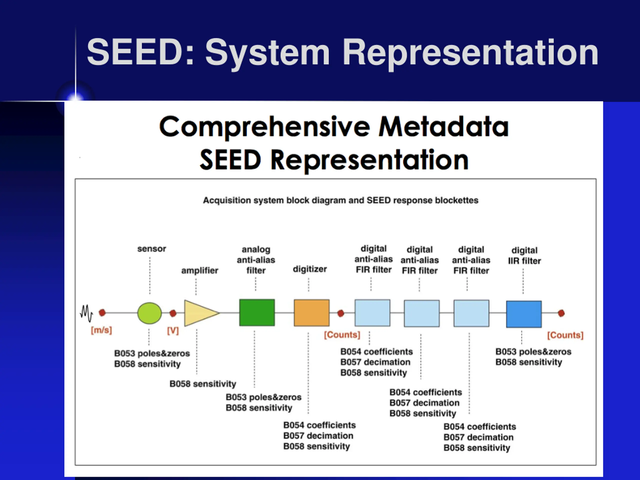 SEED in Practice Recordings of digital time series data (seismic waveforms) Exchange of waveform data (Real time, archive) Archiving of digital waveform data (global to local) Storage of metadata information about the data, e.g. station information, sensor End user ( analysis software) Exceptions Not for non-time series data Not for unequal time-interval sampled data (except logs) Parametric data possible (e.g. phase readings) but rarely used; IASPEI Seismic Format QuakeML