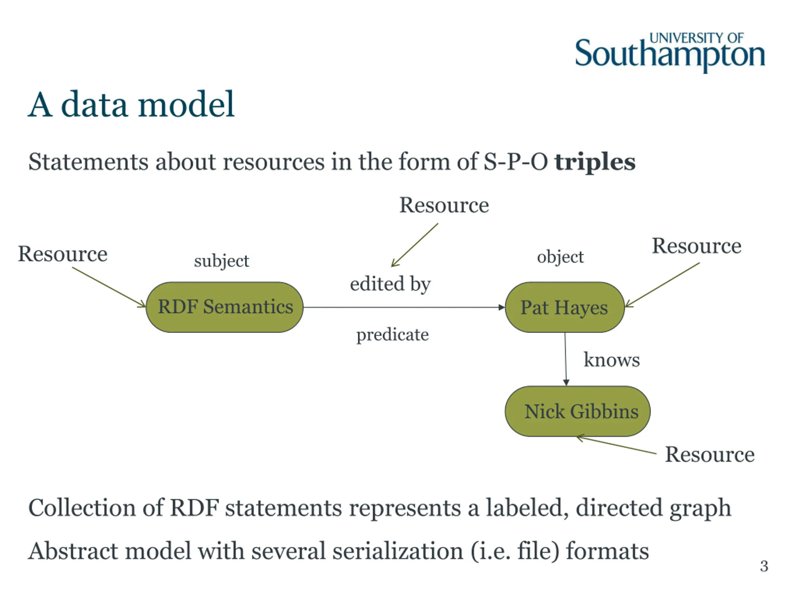 A data model Statements about resources in the form of S-P-O triples Resource Resource Resource object subject edited by RDF Semantics Pat Hayes predicate knows Nick Gibbins Resource Collection of RDF statements represents a labeled, directed graph Abstract model with several serialization (i.e. file) formats 3