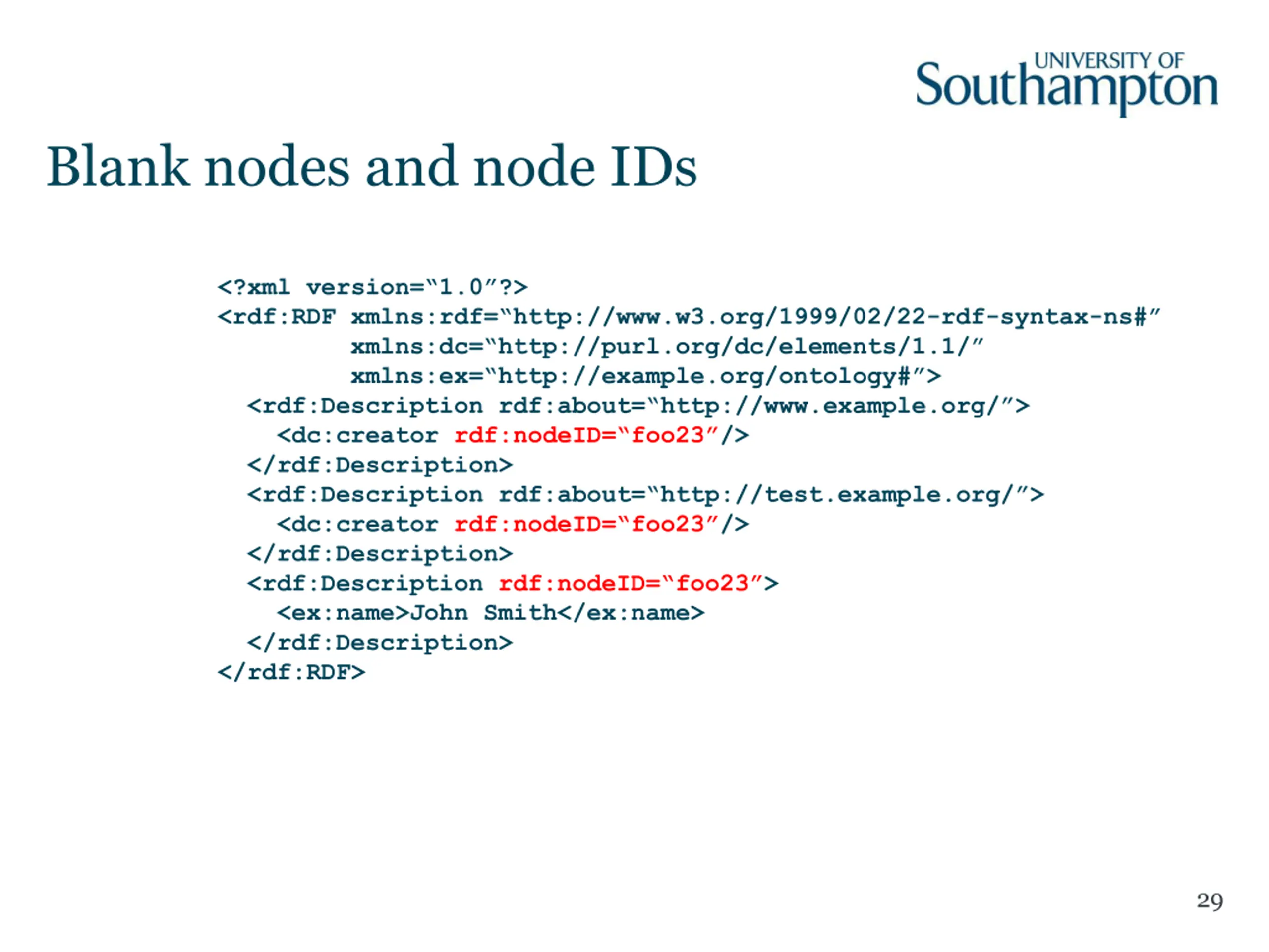 Blank nodes and node IDs <?xml version= 1.0 ?> <rdf:RDF xmlns:rdf= http://www.w3.org/1999/02/22-rdf-syntax-ns# xmlns:dc= http://purl.org/dc/elements/1.1/ xmlns:ex= http://example.org/ontology# > <rdf:Description rdf:about= http://www.example.org/ > <dc:creator rdf:nodeID= foo23 /> </rdf:Description> <rdf:Description rdf:about= http://test.example.org/ > <dc:creator rdf:nodeID= foo23 /> </rdf:Description> <rdf:Description rdf:nodeID= foo23 > <ex:name>John Smith</ex:name> </rdf:Description> </rdf:RDF> 29
